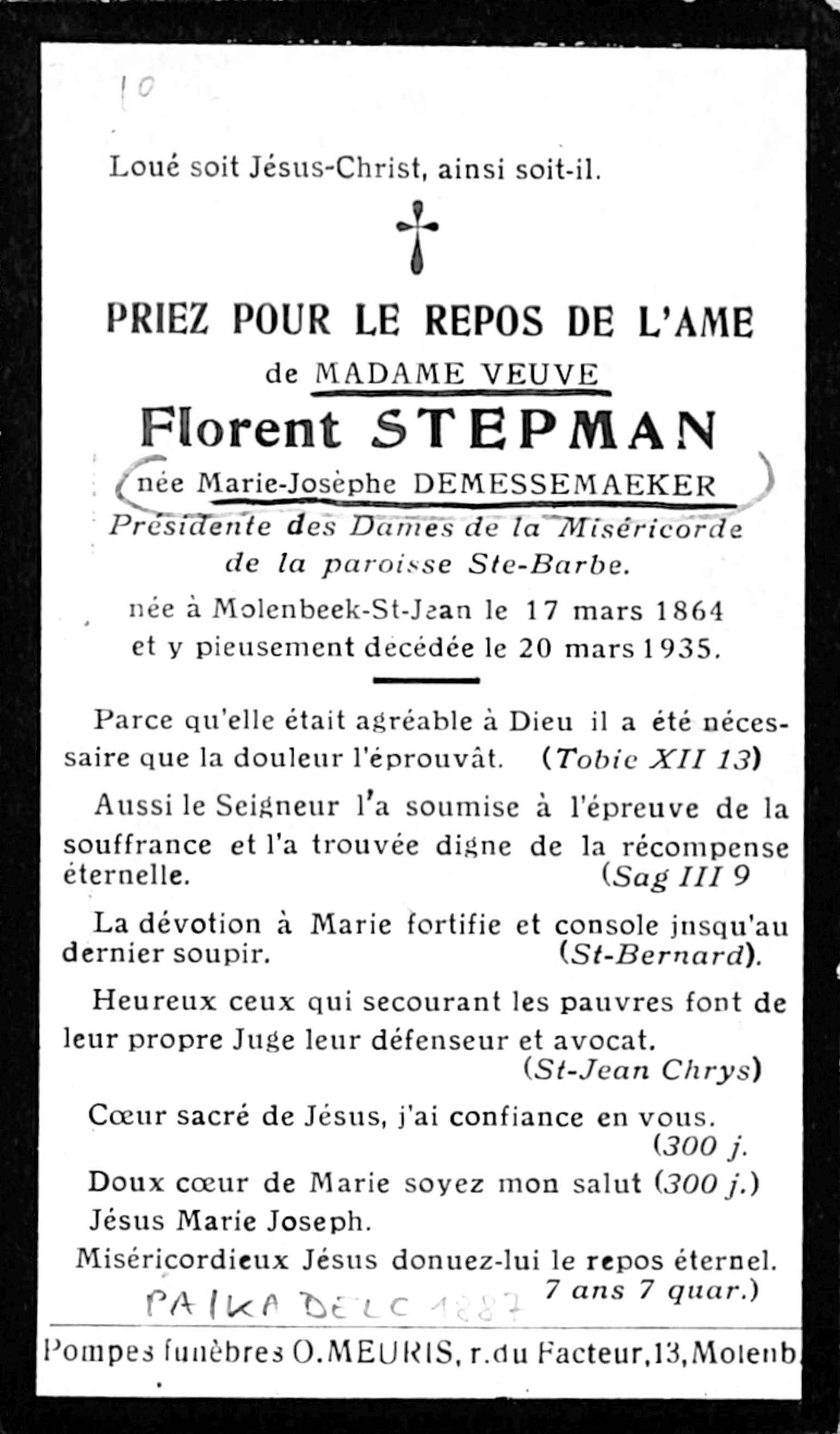Doodsprentje Marie-Josèphe Demessemaeker, weduwe van Florent Stepman (Sint-Jans-Molenbeek, 1864-1935), begrafenisonderneming O. Meuris (Sint-Jans-Molenbeek), 1935.