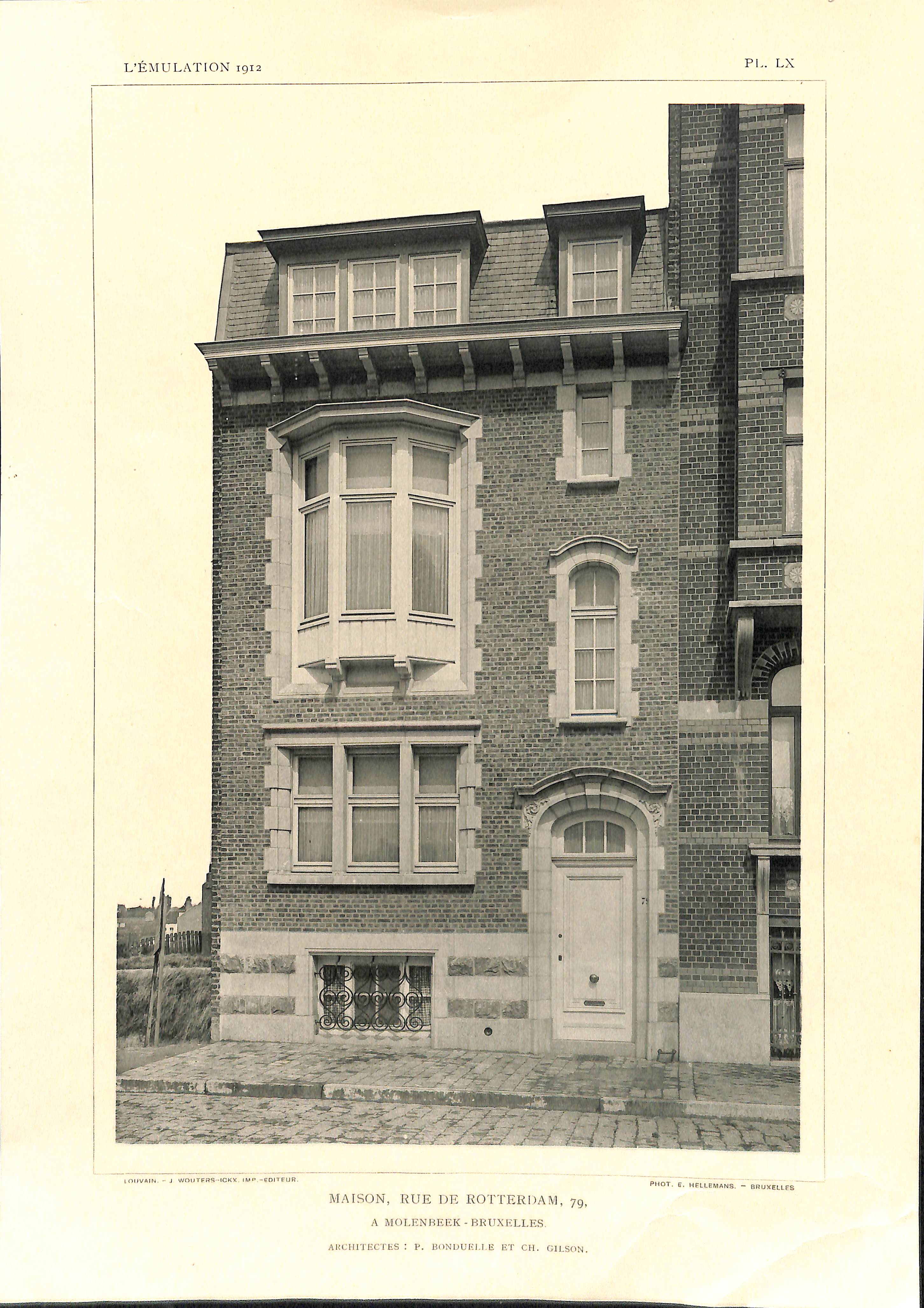 Plaat Voorgevel van het huis Rotterdamstraat 79 (Sint-Jans-Molenbeek), door de architecten P. Bonduelle en Ch. Gilson, uittr. uit L'Emulation, 1912, pl. LX.