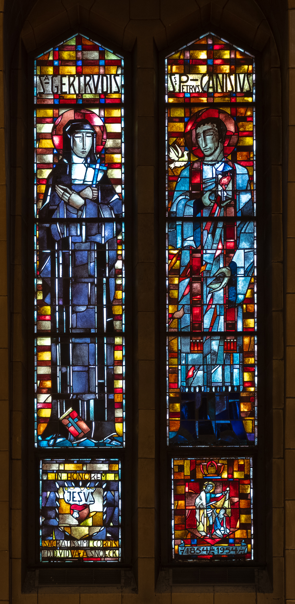 Glas-in-loodraam van H. Gertrudis geschonken door mevrouw Snoeck in 1956 en glasramen van H. Petrus Canisius geschonken door de firma Nestor Martin in 1954-55.