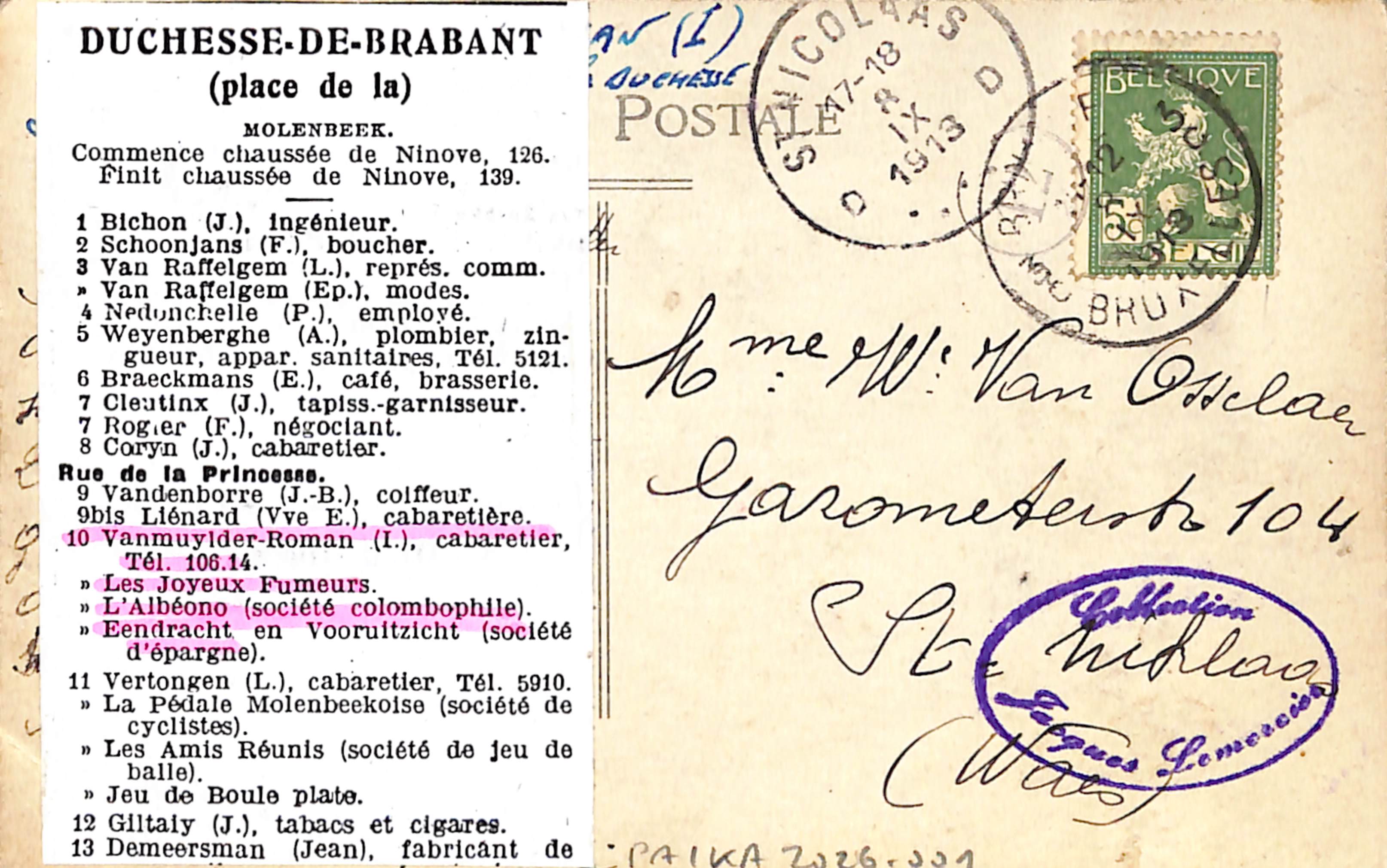 Fotokaart Café van I. Vanmuylder-Roman, Prinsesstraat 10 (Sint-Jans-Molenbeek), fotogr. onbekend, 1913.