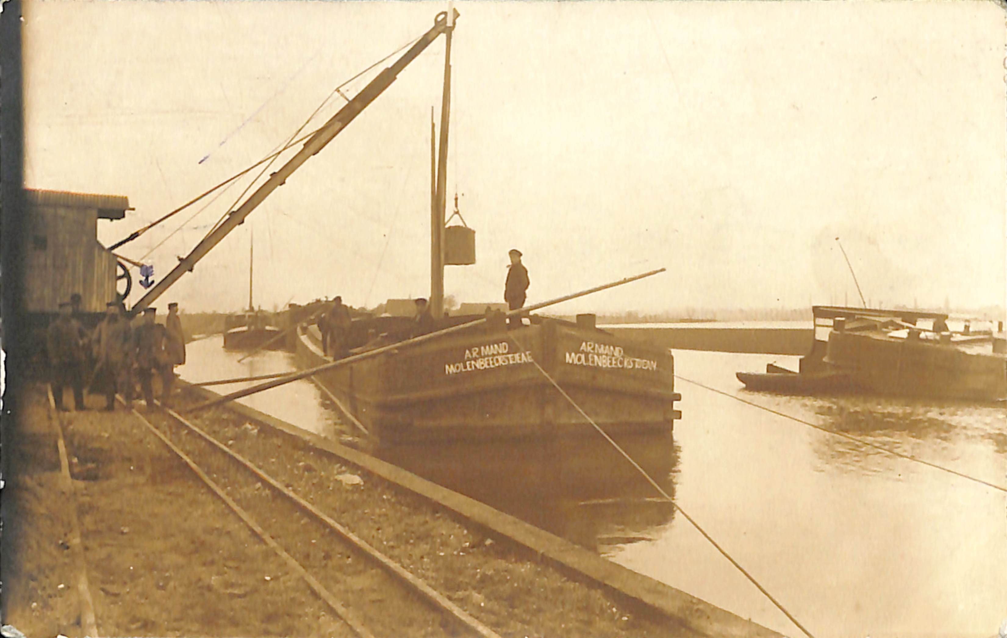 Fotokaart Duitse soldaten bij de aak “Armand” uit Sint-Jans-Molenbeek aangemeerd, fotogr. onbekend, 1915.