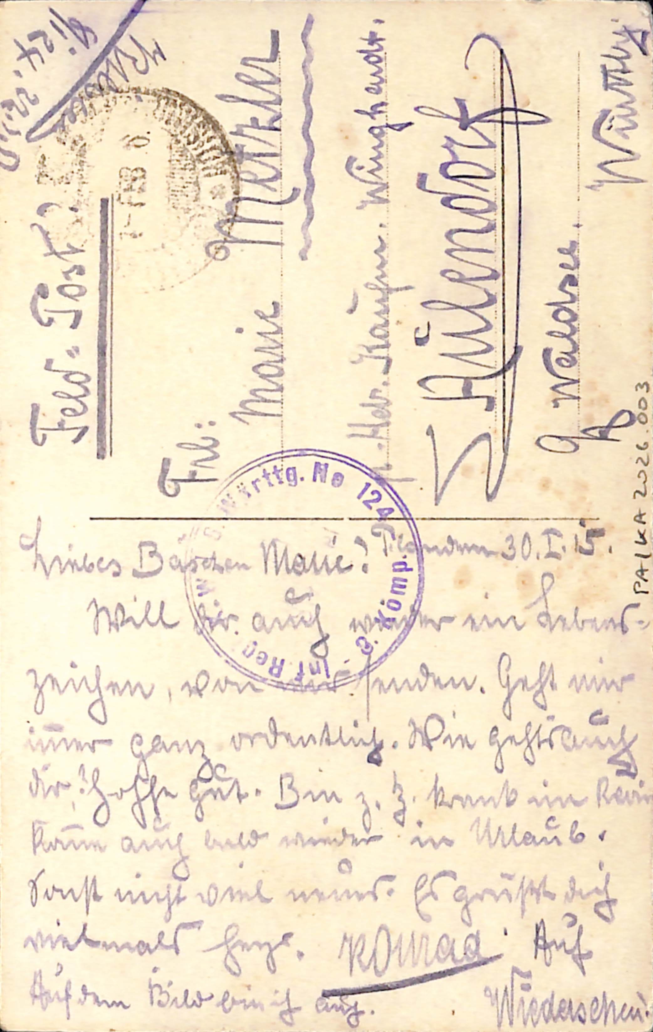 “Feld-Postkarte” (oorlogspostkaart) verstuurd door een Duitse soldaat (links op de foto) aan zijn nicht in Duitsland.
