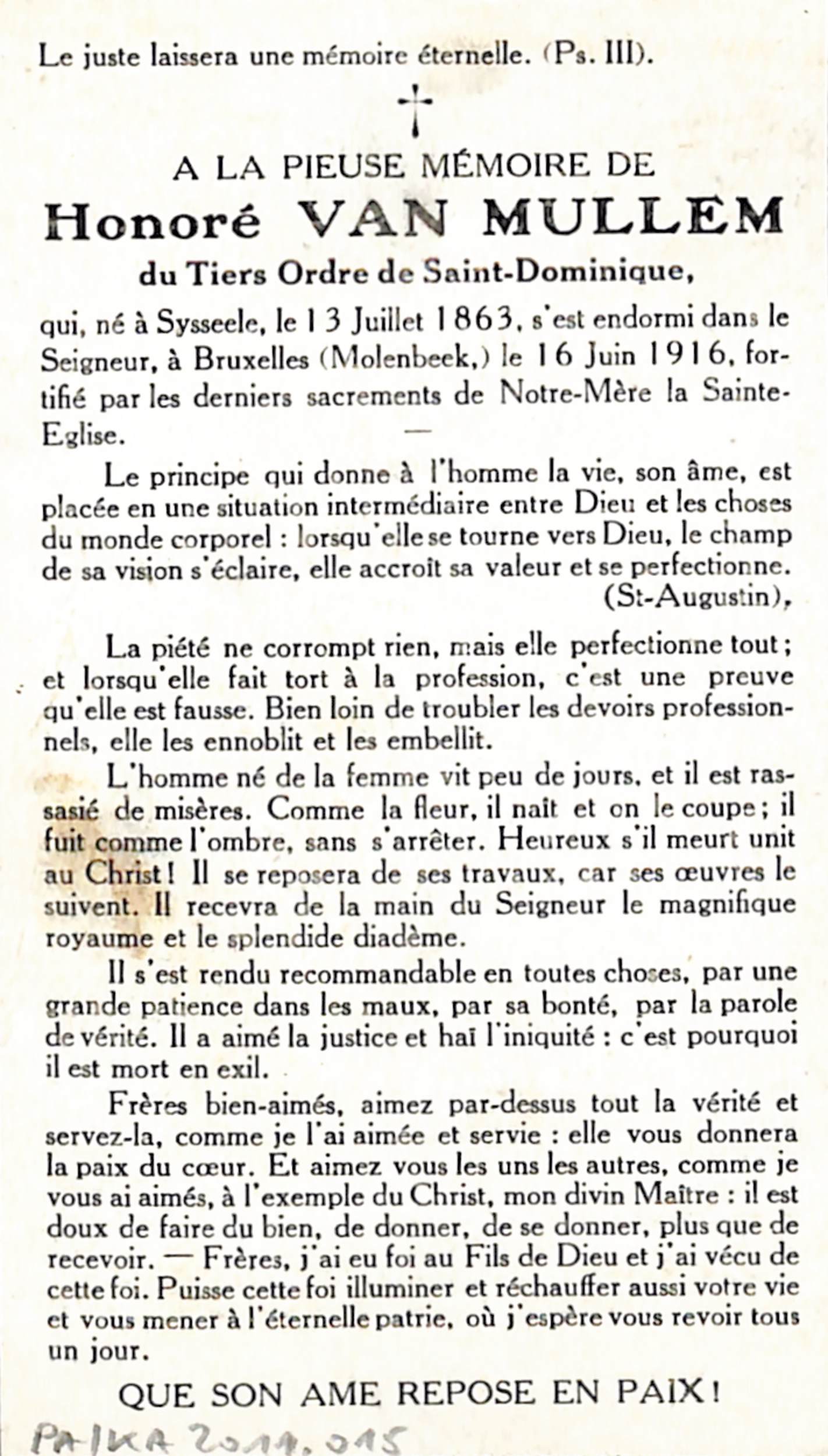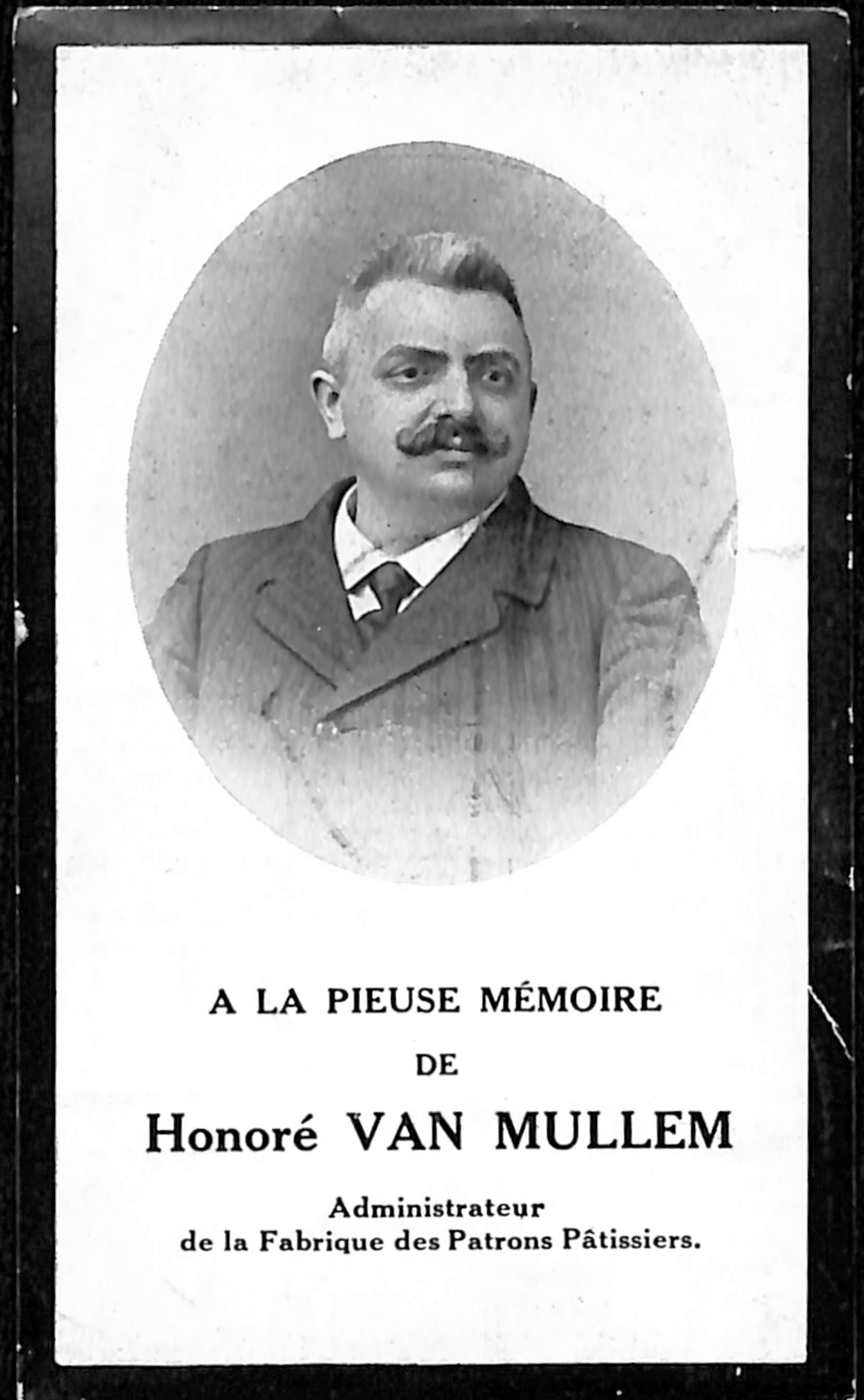 Doodsprentje Honoré Van Mullem, bestuurder van de fabriek van de Patrons Pâtissiers (Sijssele, 1863 - Sint-Jans-Molenbeek, 1916), 1916.