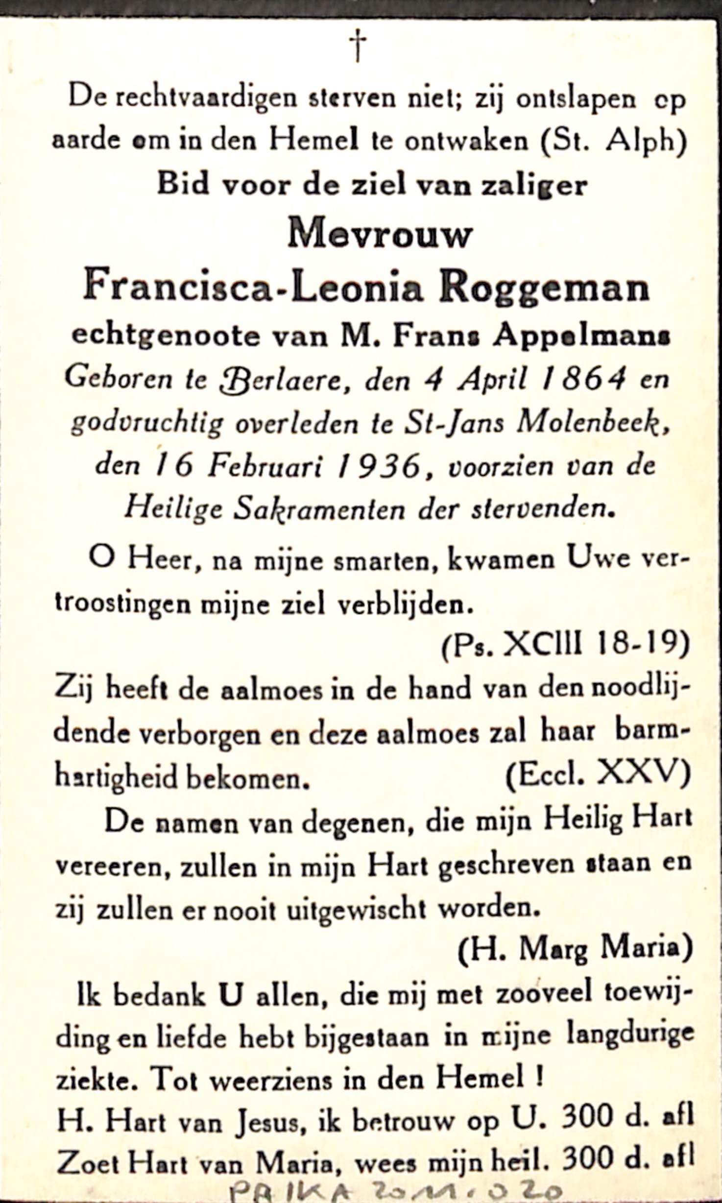Doodsprentje Francisca-Leonia Roggeman, echtgenote van Frans Appelmans (Berlaere, 1864 - Sint-Jans-Molenbeek, 1936), 1936.