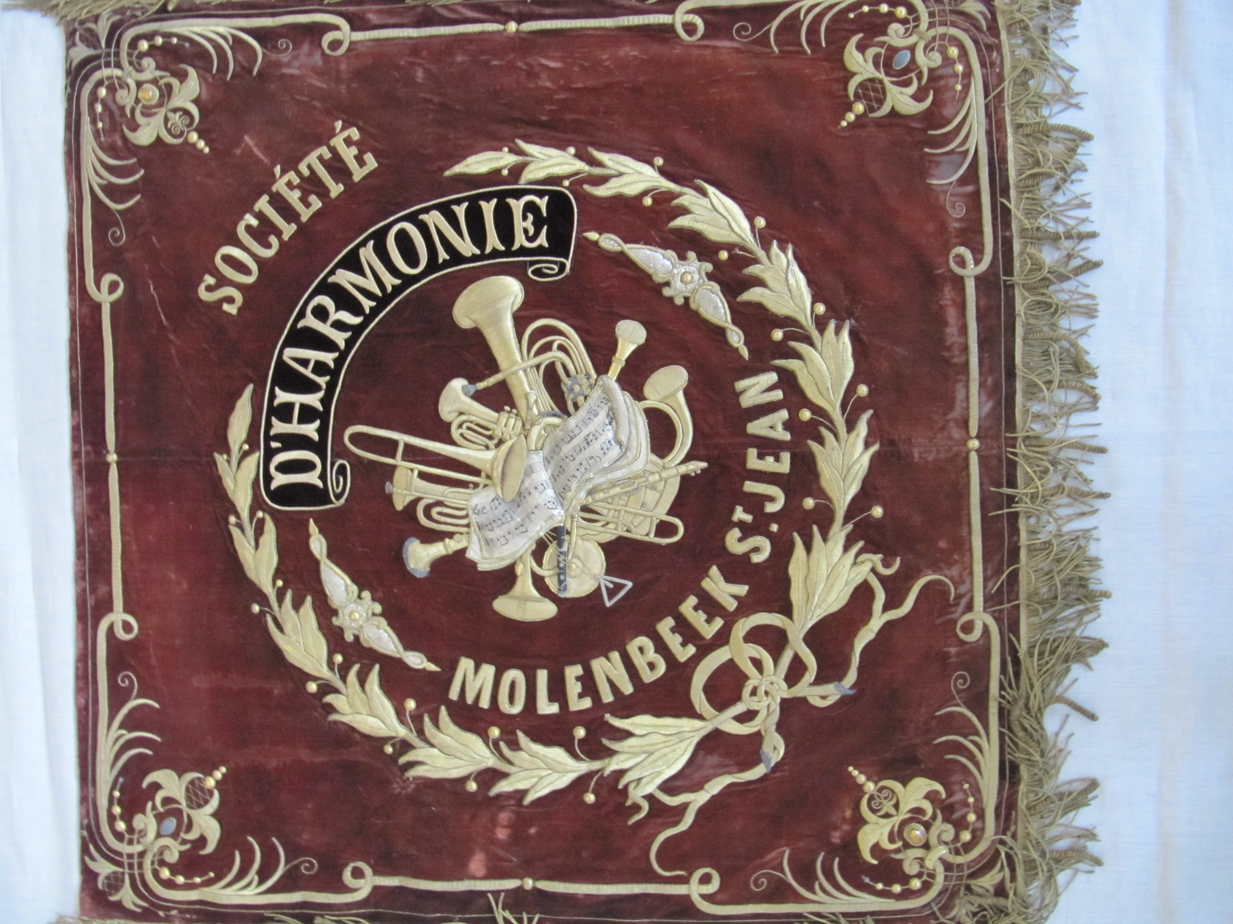 Enkelzijdige vlag in bruin fluweel en zijde, versierd met een gouden bies, borduursels en franjes (onderaan, bovenaan en rechts), zonder datum, gesigneerd met de initialen “JDT” (rechtsonder).