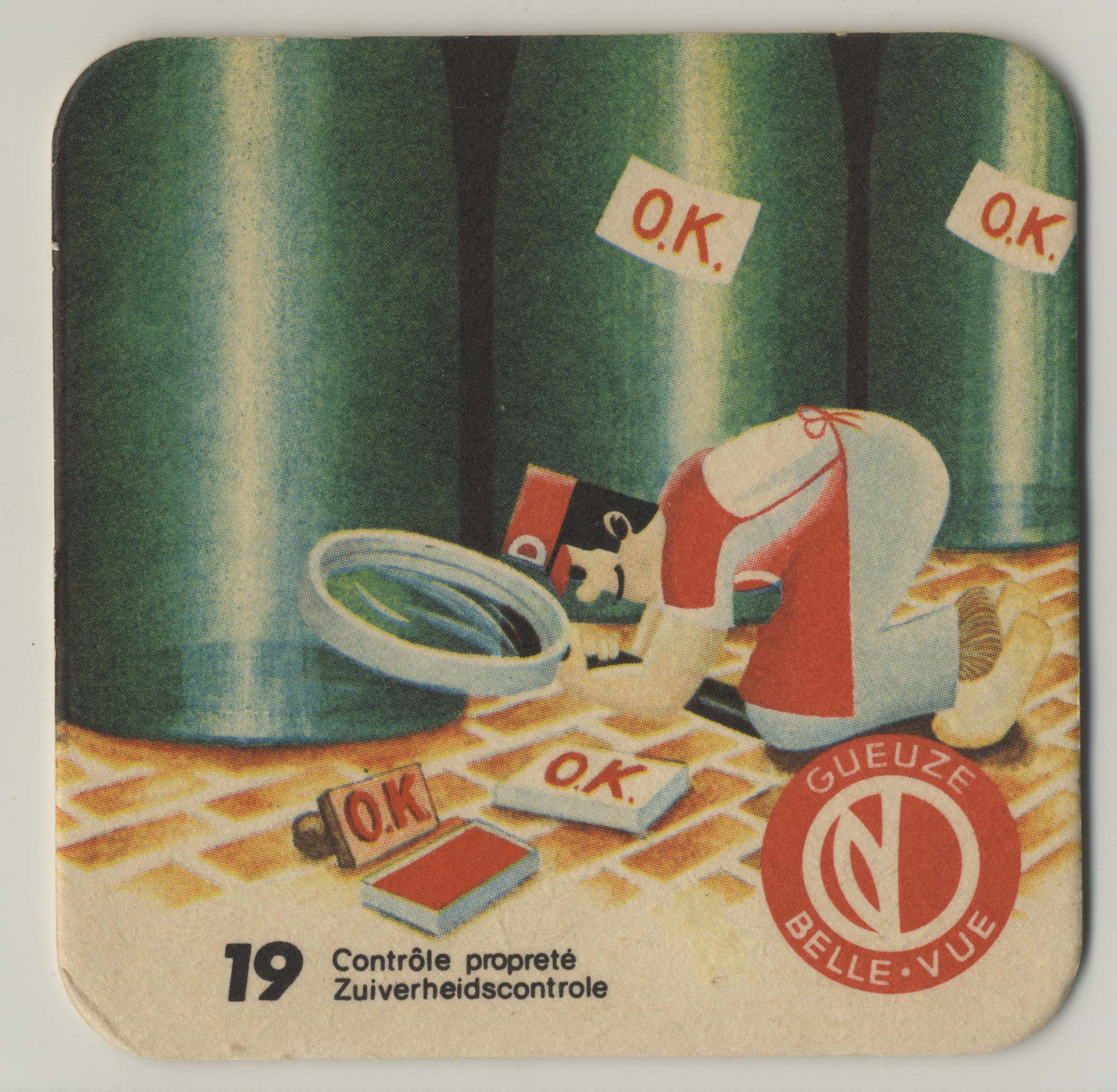 Reclame-bierviltje van Brasserie Belle-vue met een afbeelding van het productieproces van gueuze, 19: Zuiverheidscontrole, s.d.