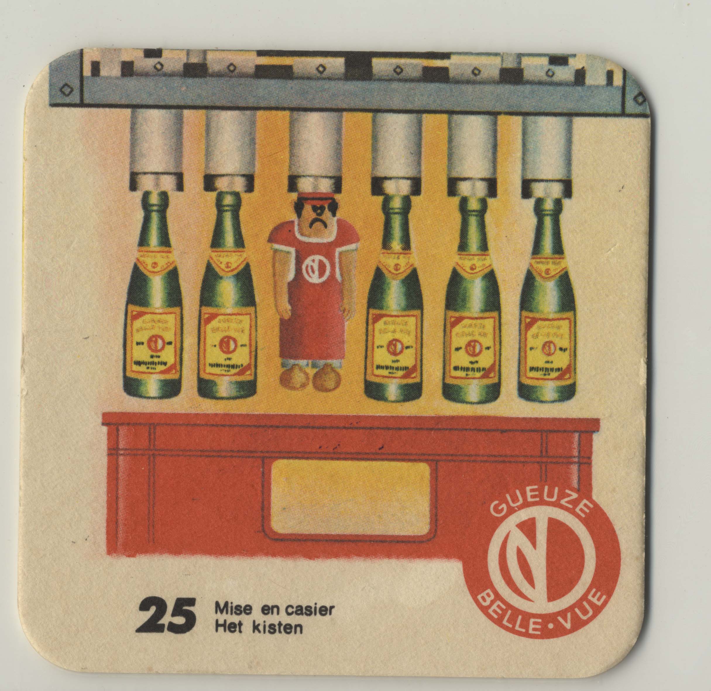 Reclame-bierviltje van Brasserie Belle-vue met een afbeelding van het productieproces van geuze, 25: Het kisten, s.d.