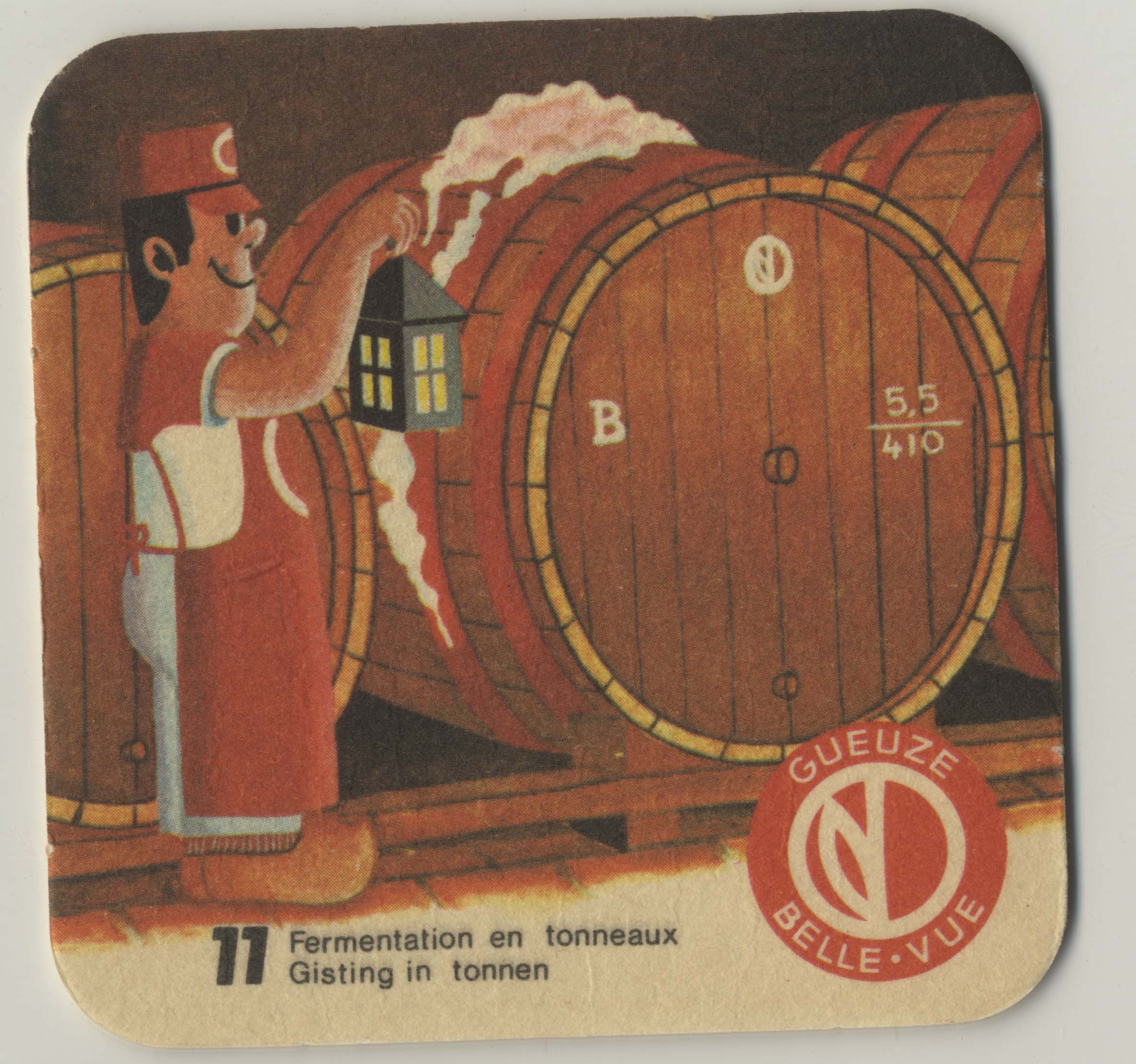 Reclame-bierviltje van Brasserie Belle-vue met een afbeelding van het productieproces van gueuze, 11: Gisting in tonnen, s.d.