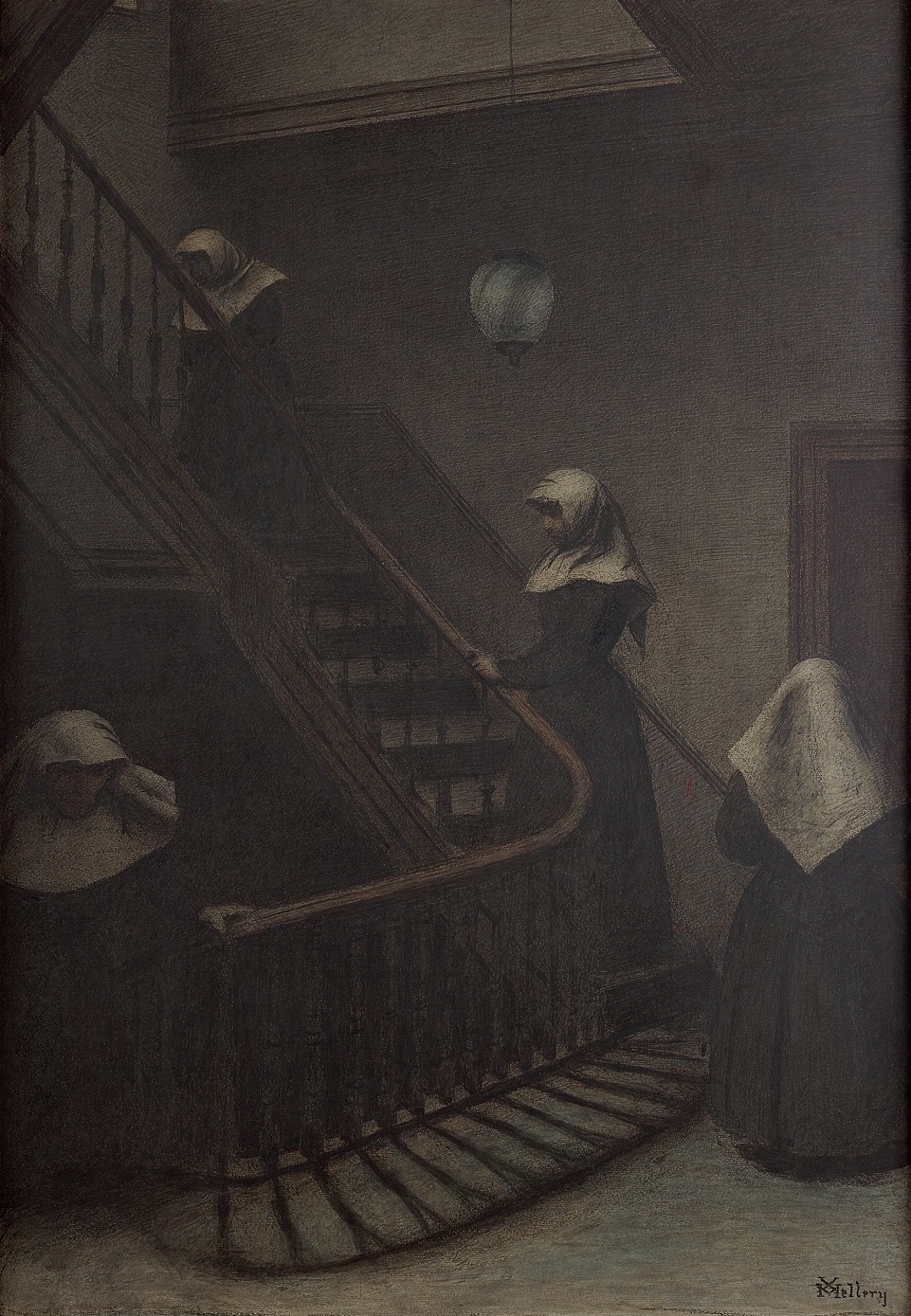 stelt. Het licht dat van bovenaf op het trappenhuis valt, accentueert de witte sluiers van de zusters en de glazen bol van de lamp. Door zwart krijt op het gegreinde papier