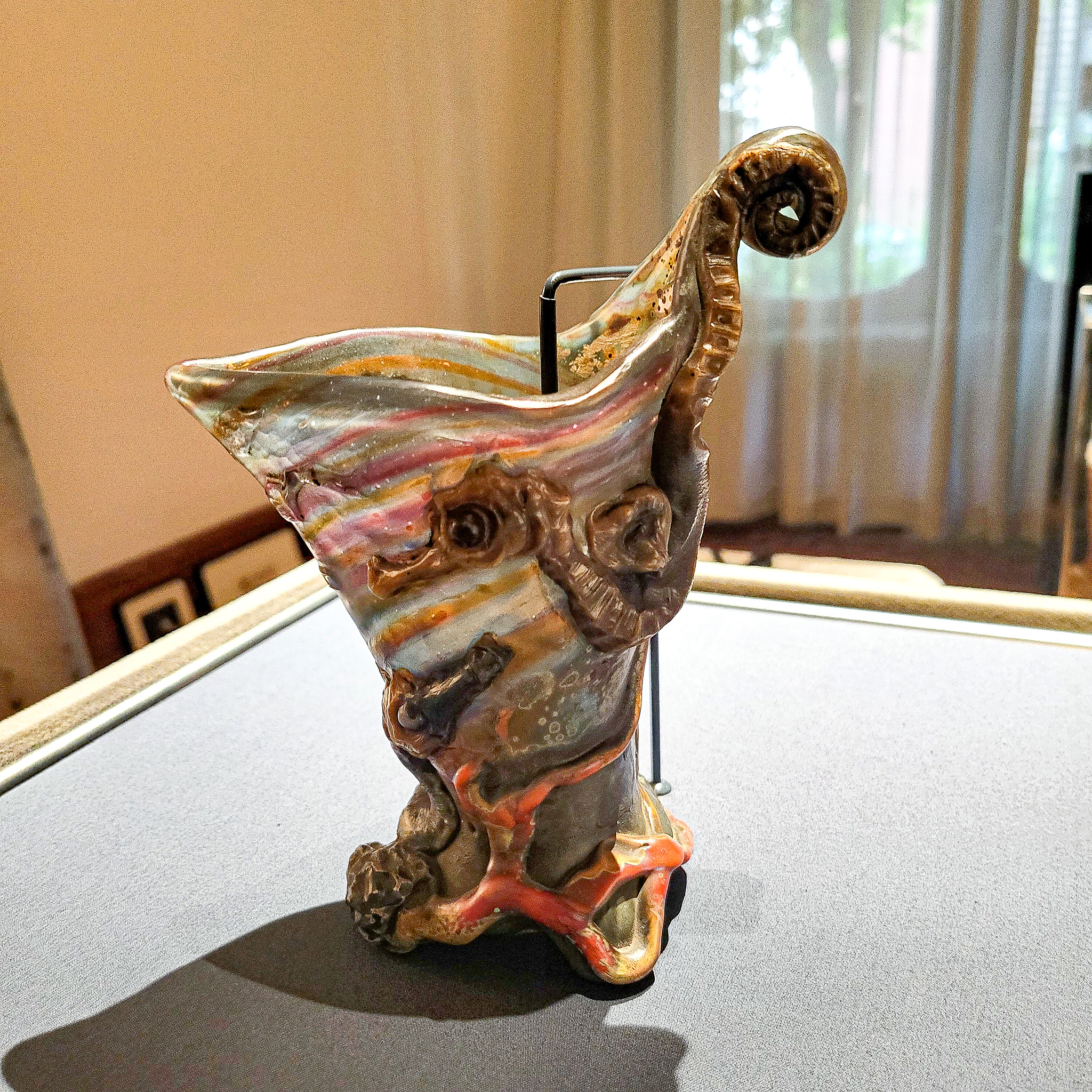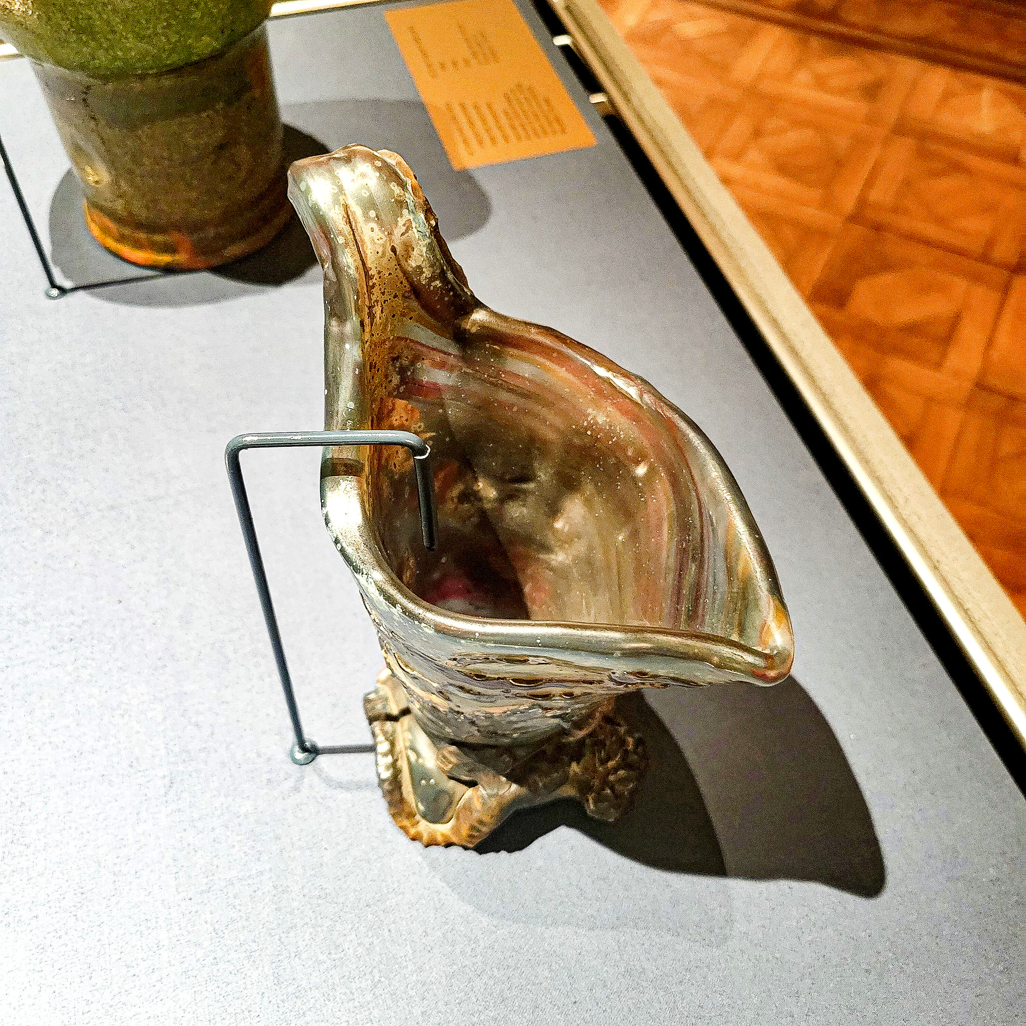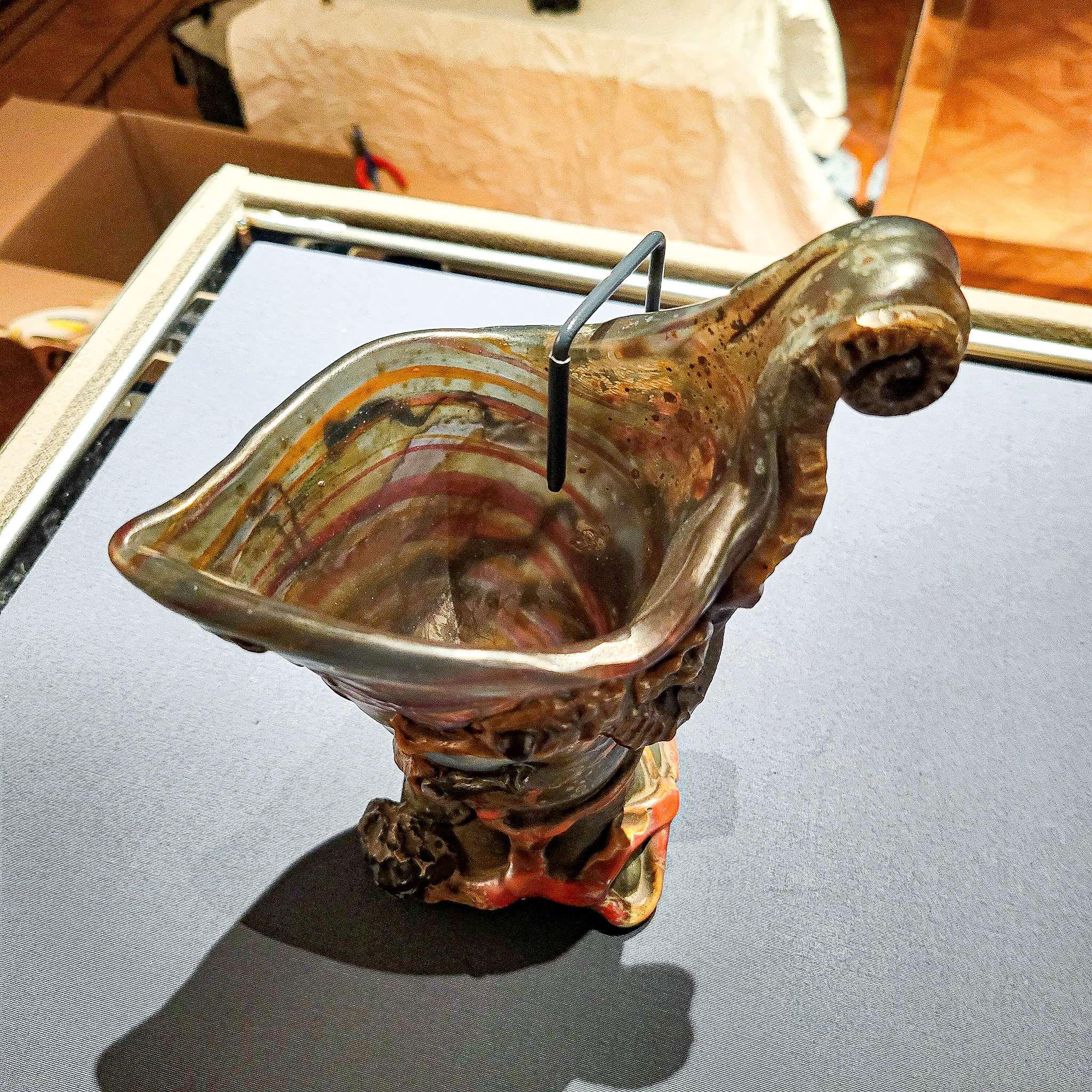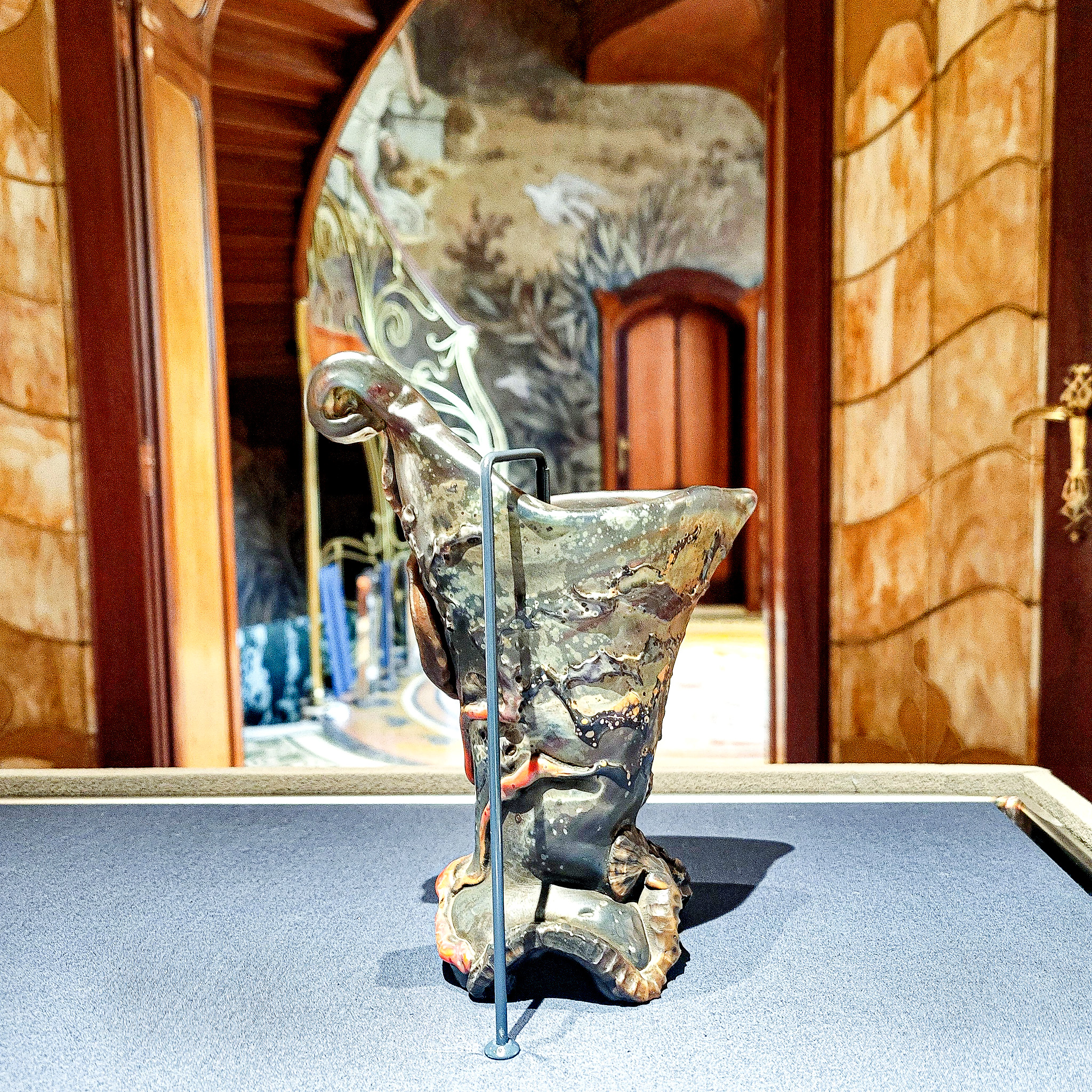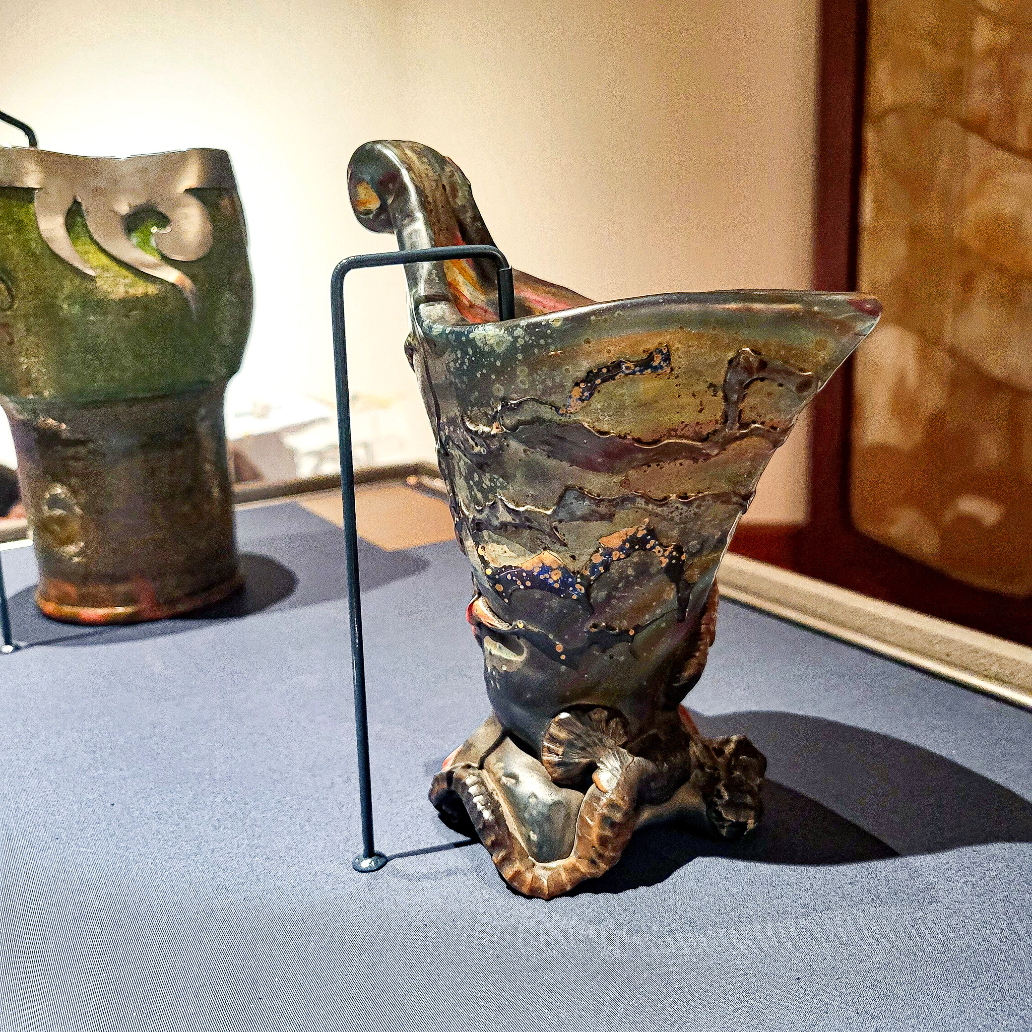 Schenkkan, meerlagig geblazen glas, versiering van ingesmolten en opgelegd metaal, gegraveerd en gepatineerd met oxidedampen.