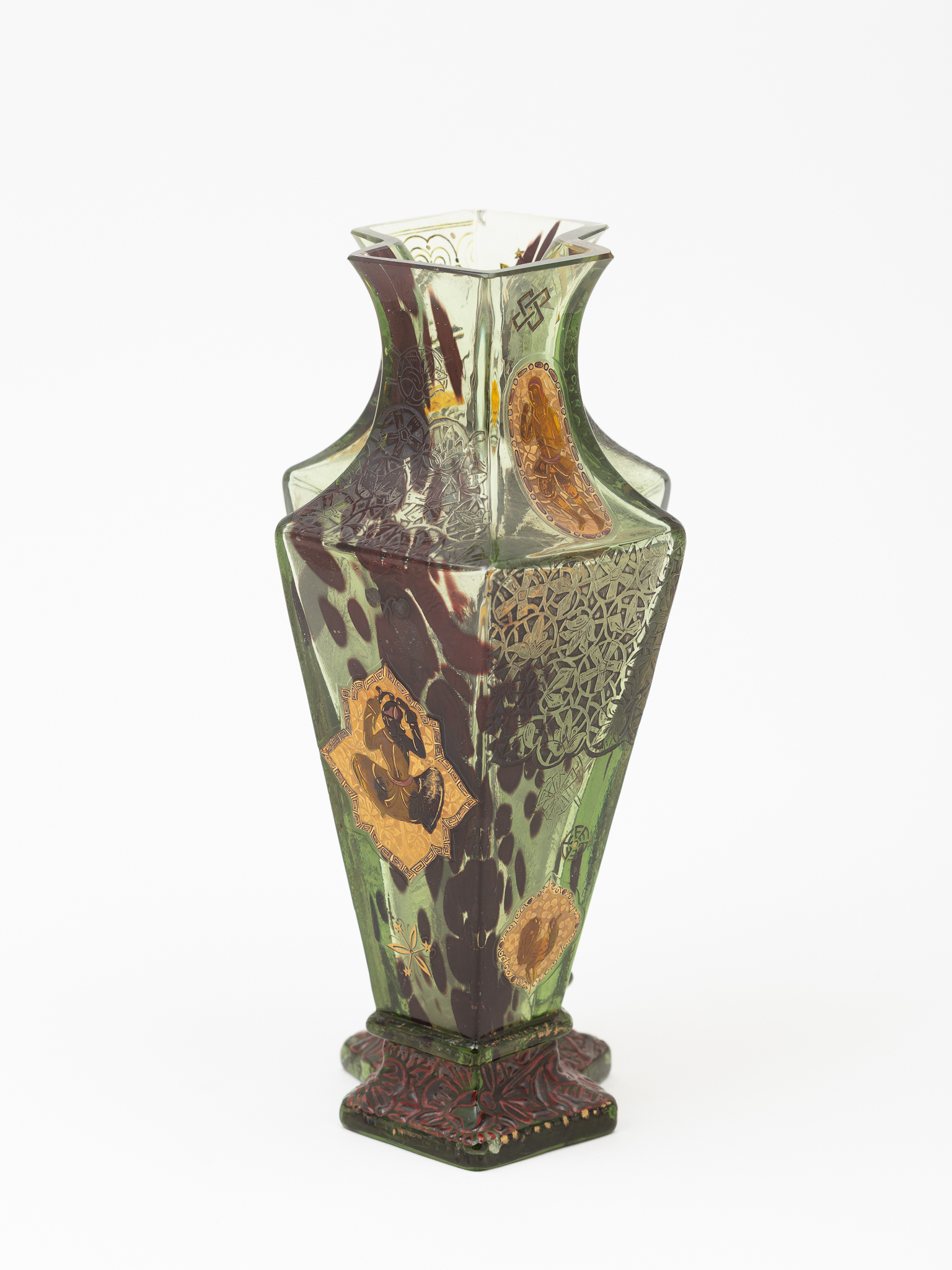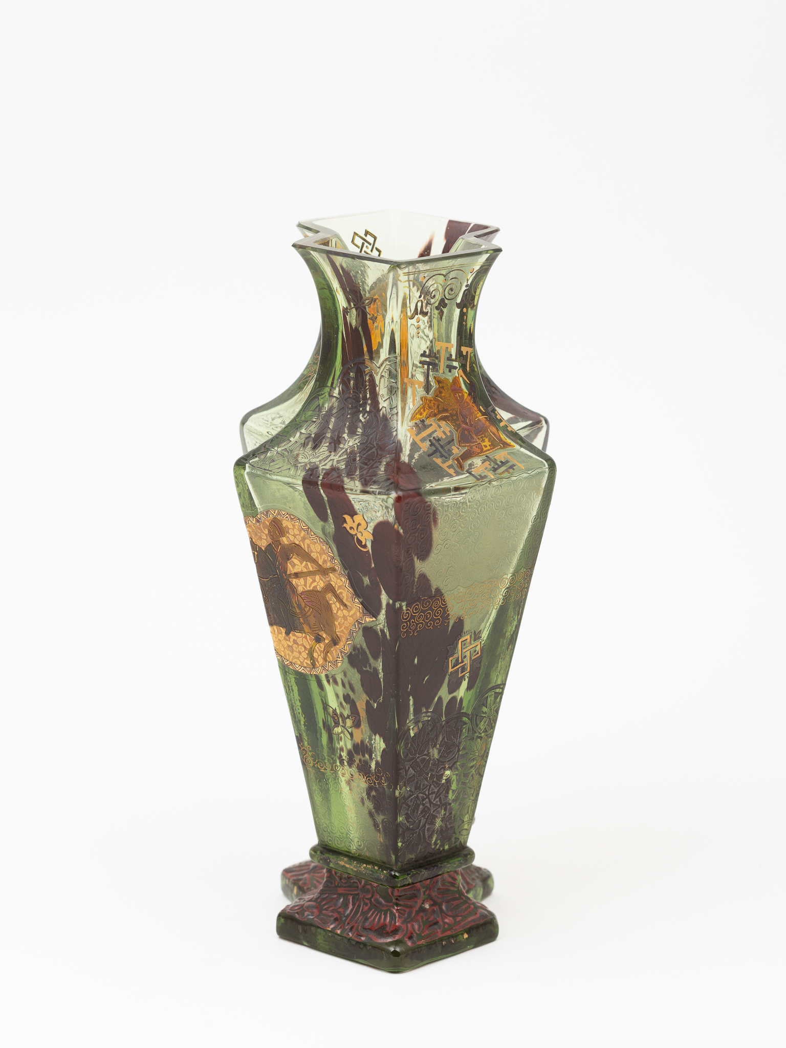Vaas, glas met marmereffecten, geëmailleerd en verguld, gehoogd met partikels, gegraveerd en gepatineerd.