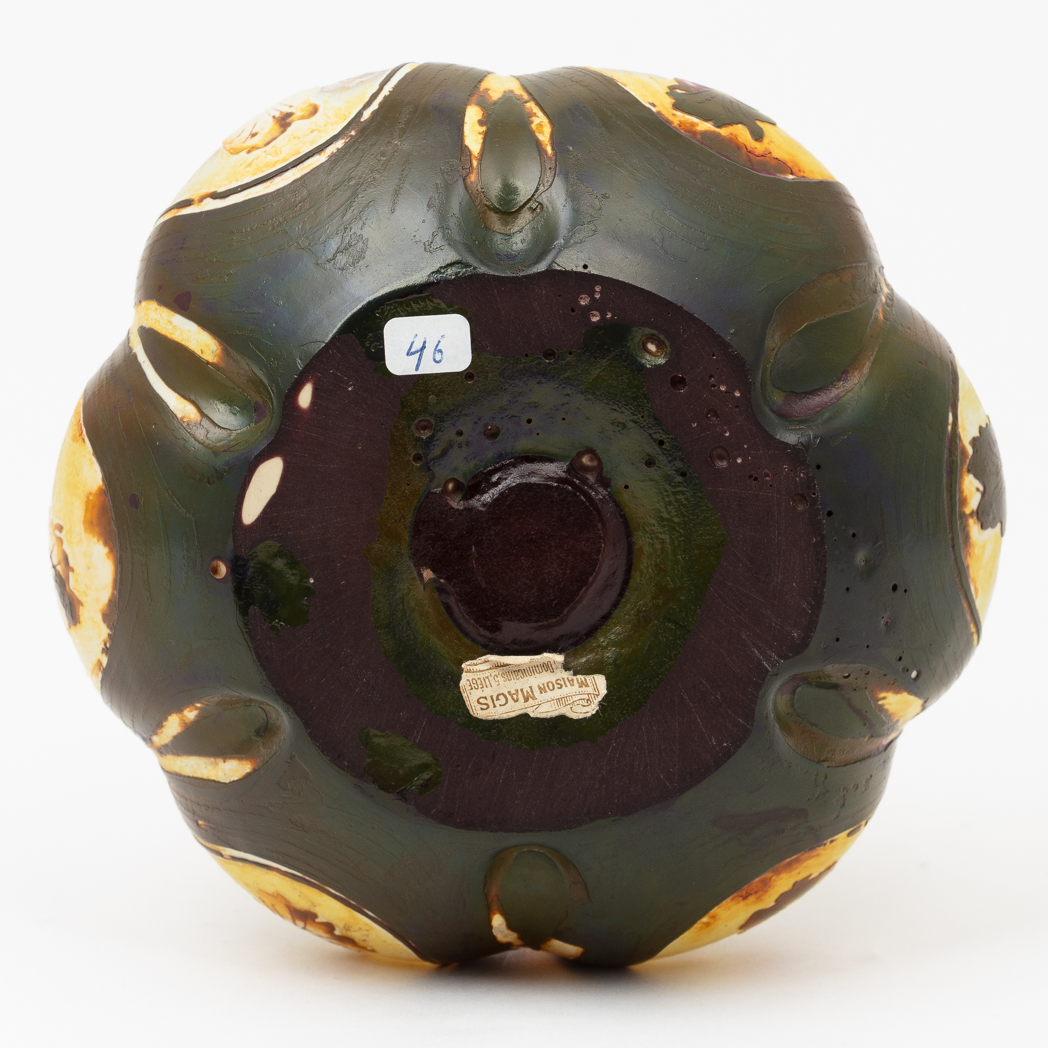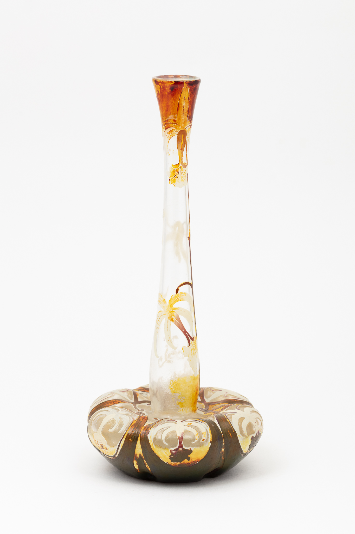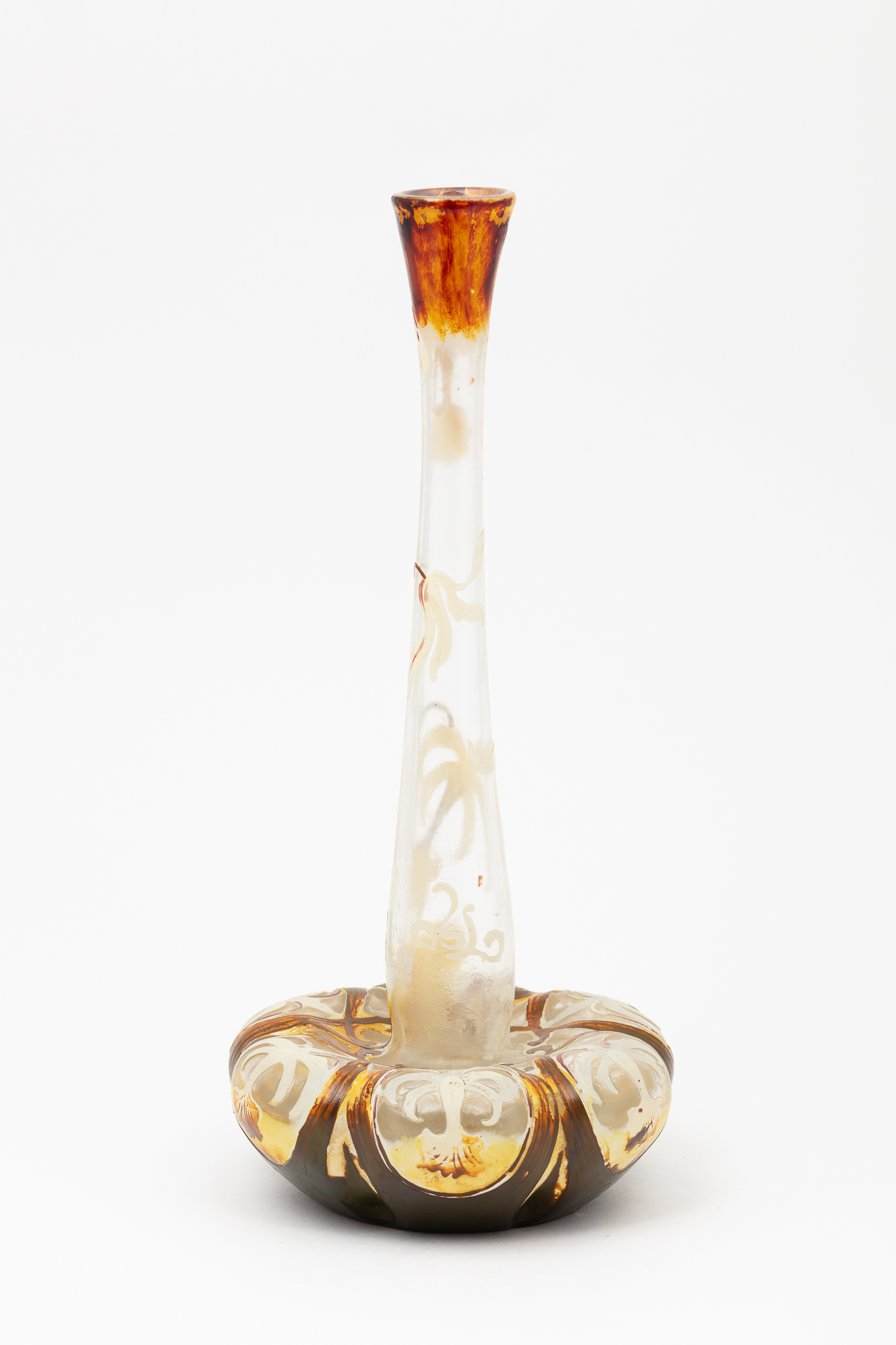 Vaas, tweelagig ontglaasd glas, geëtst met fluorwaterstofzuur, decoratie van gekleurd en met oxidedamp gemetalliseerd email