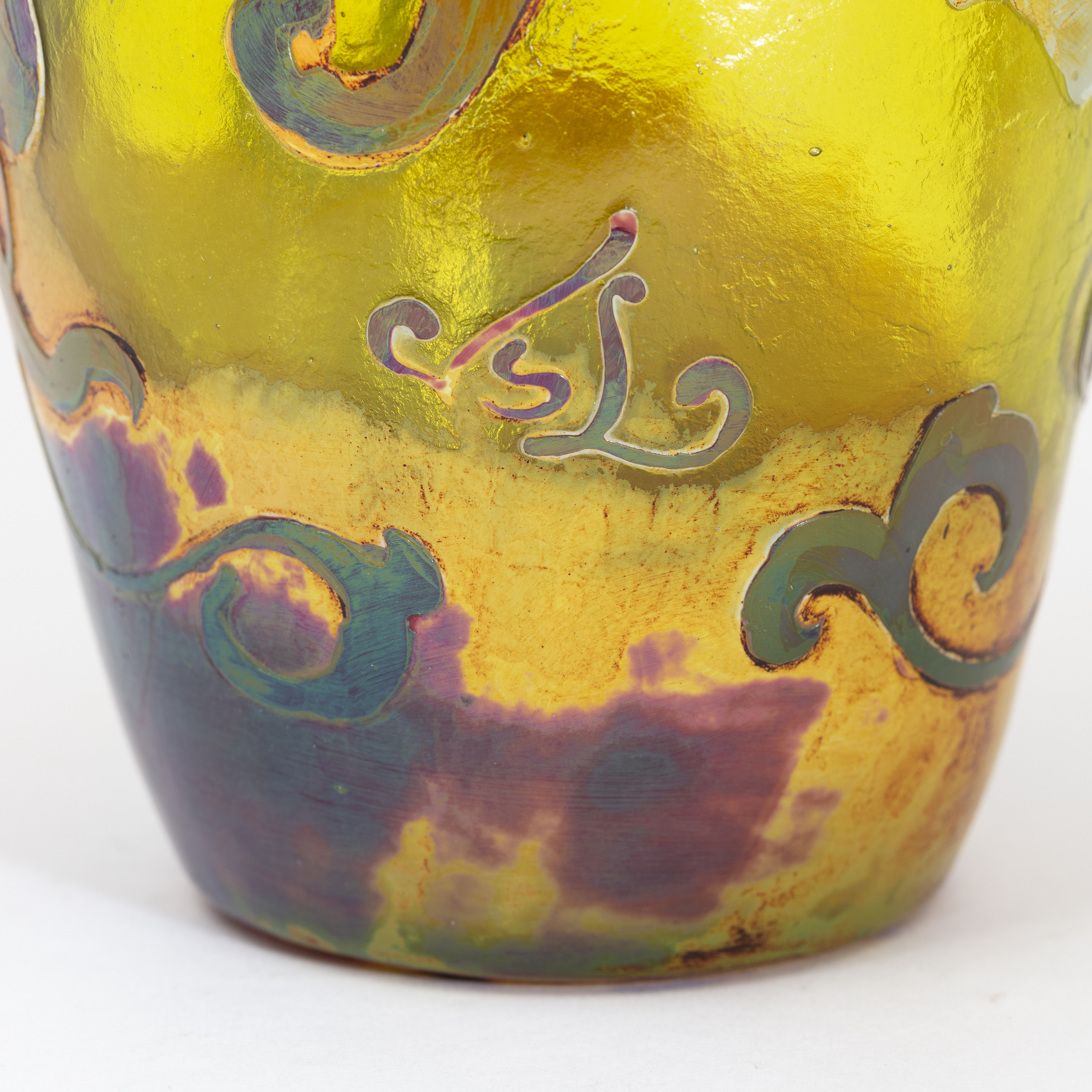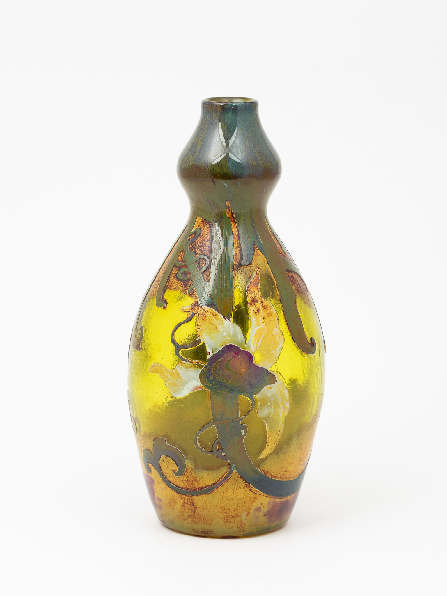 Vaas, tweelagig ontglaasd glas, geëtst met fluorwaterstofzuur, decoratie van gekleurd en met oxidedamp gemetalliseerd email