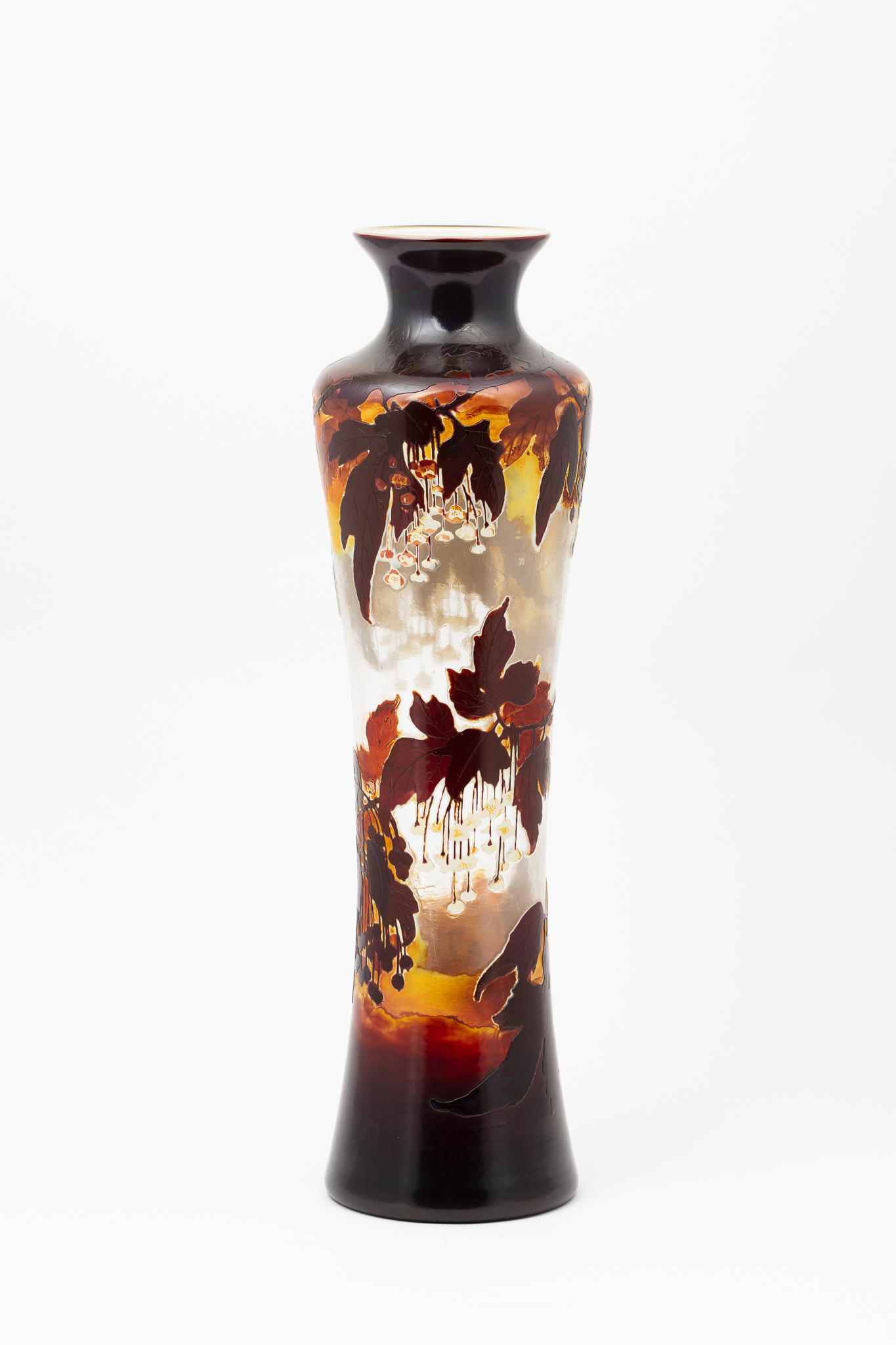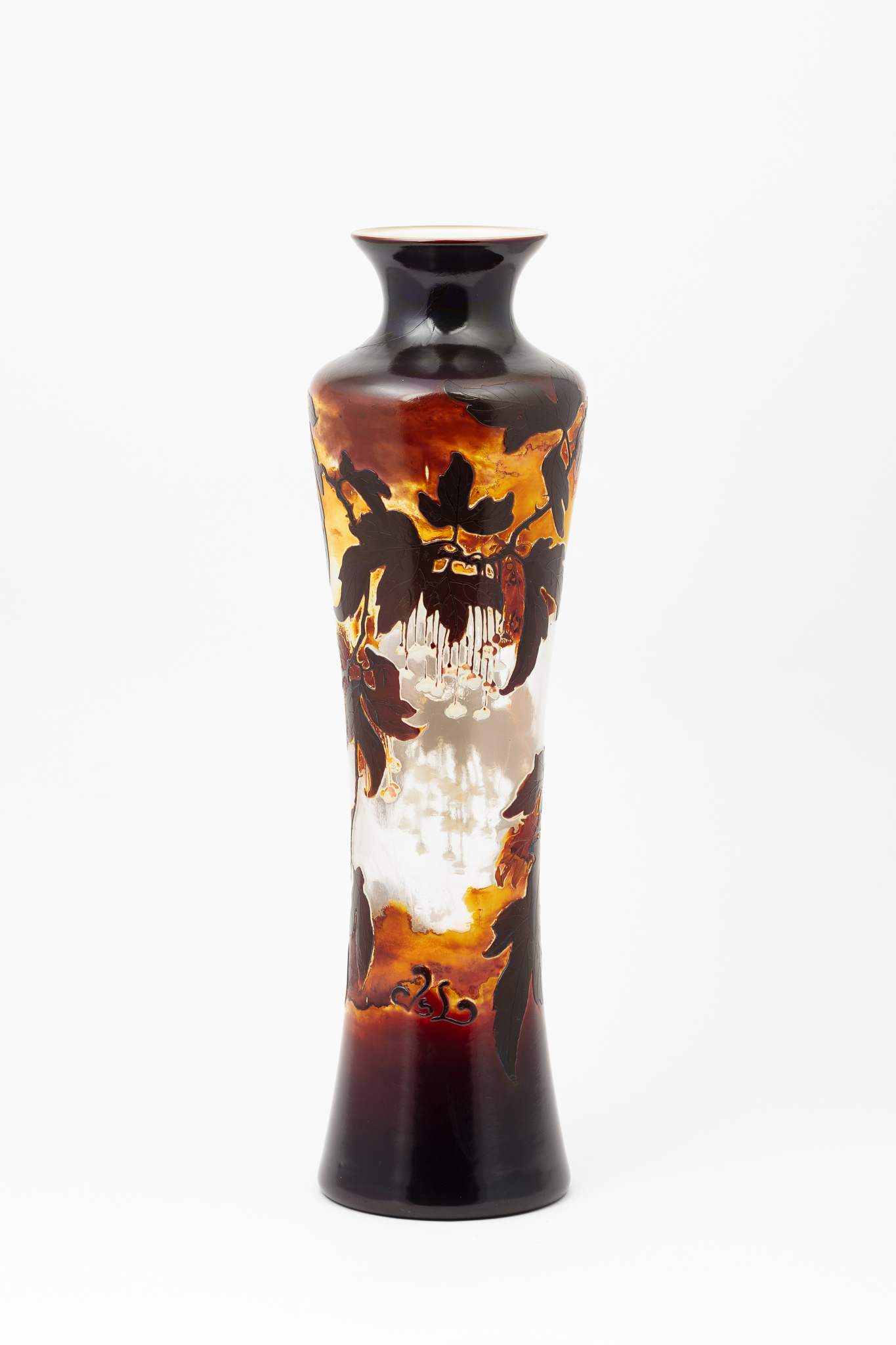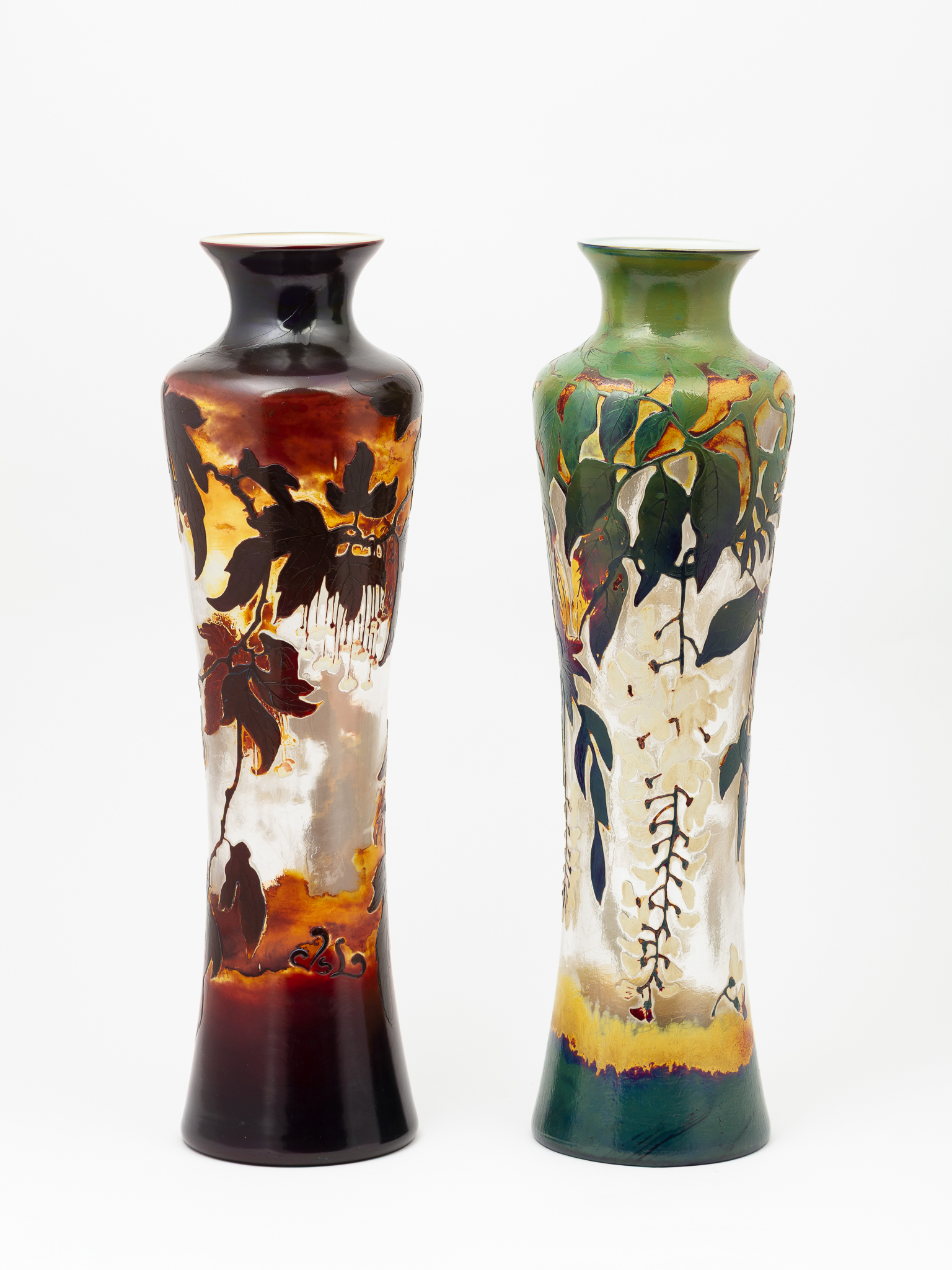 Vazen, tweelagig ontglaasd glas, geëtst met fluorwaterstofzuur, decoratie van gekleurd en met oxidedamp gemetalliseerd email