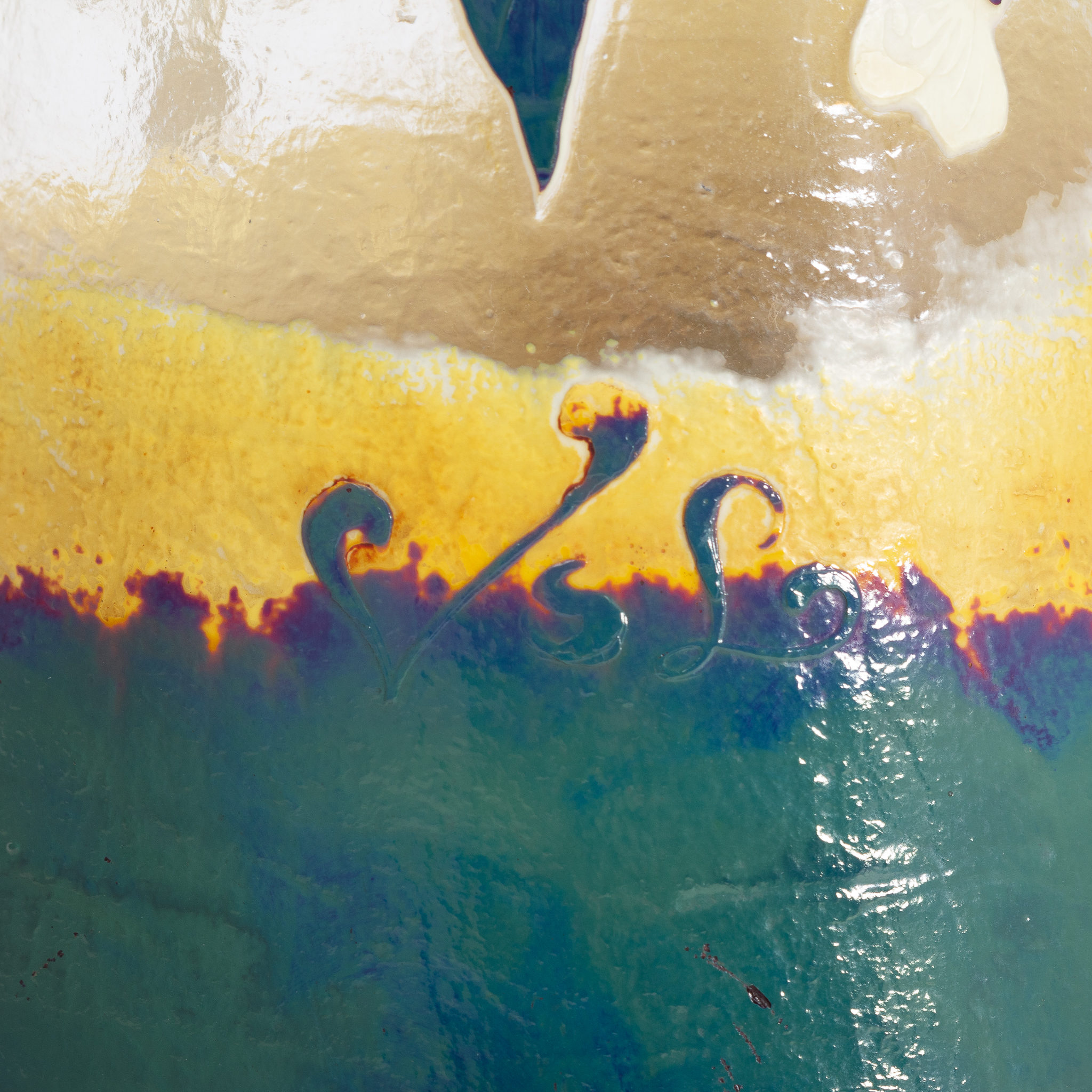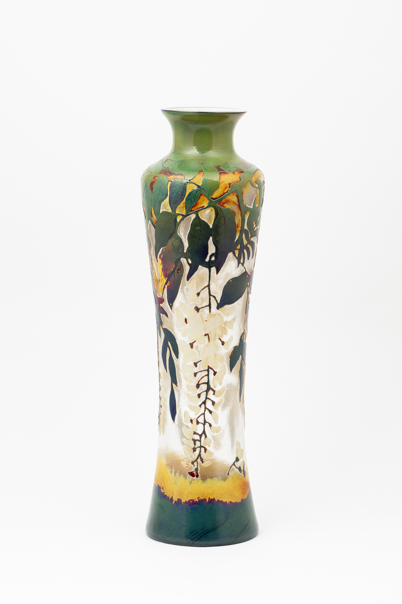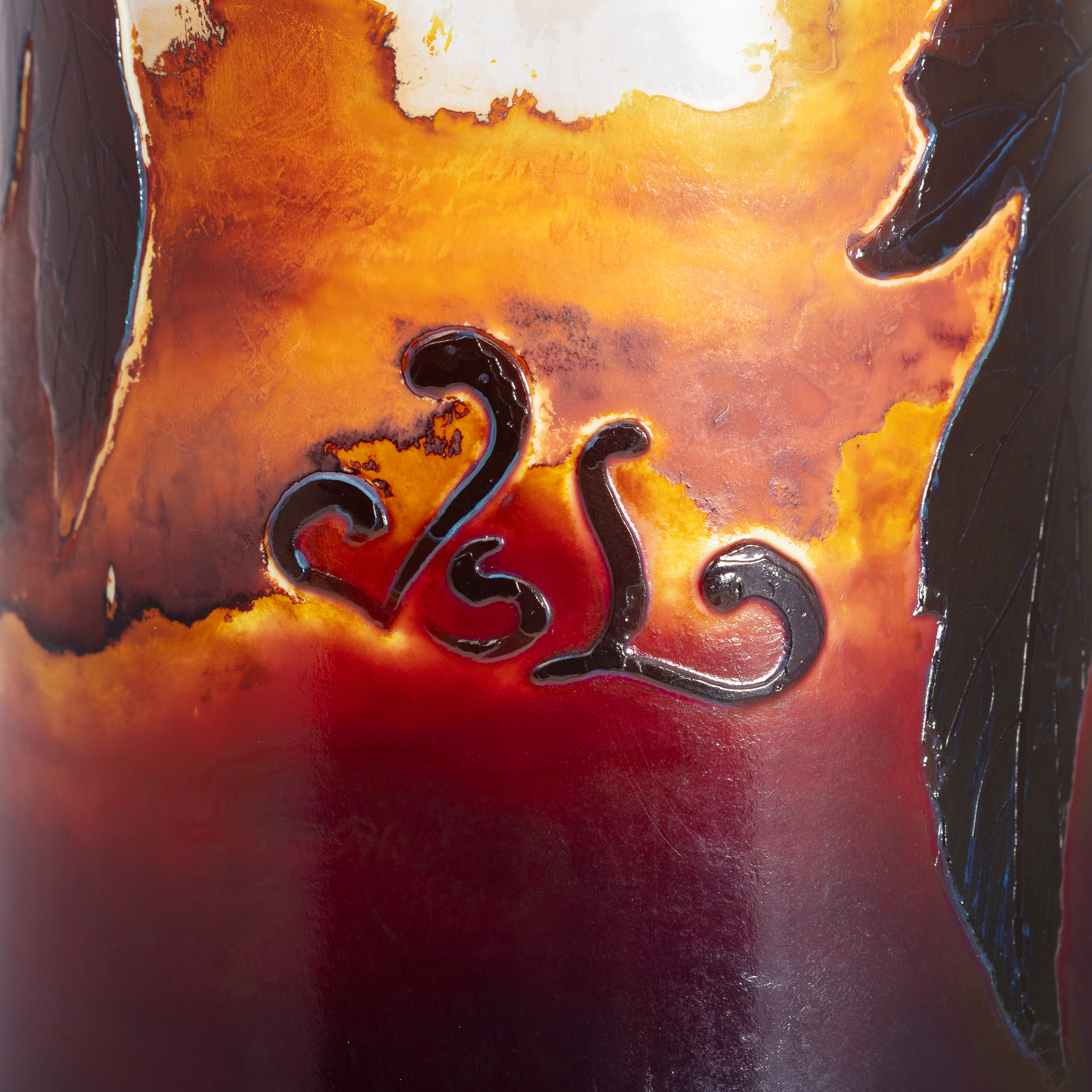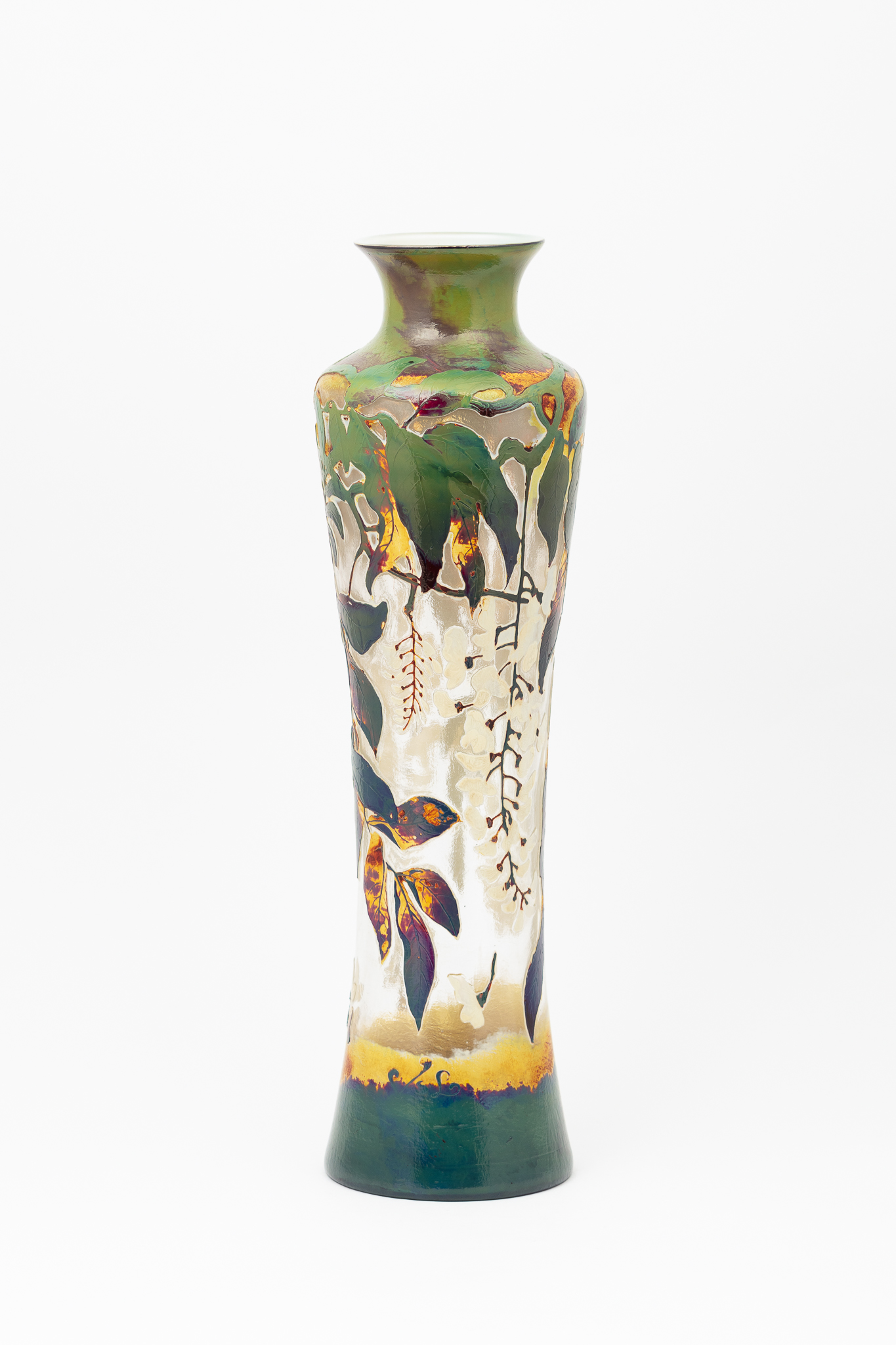 Vazen, tweelagig ontglaasd glas, geëtst met fluorwaterstofzuur, decoratie van gekleurd en met oxidedamp gemetalliseerd email