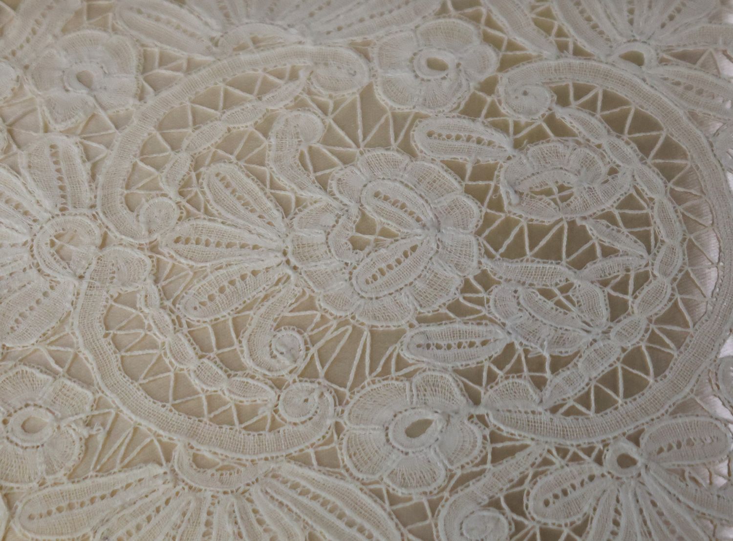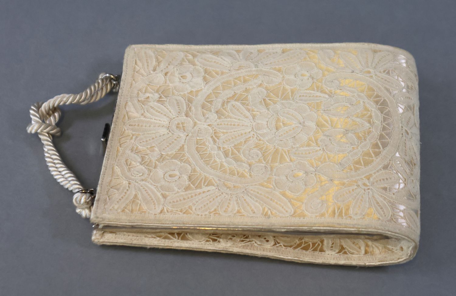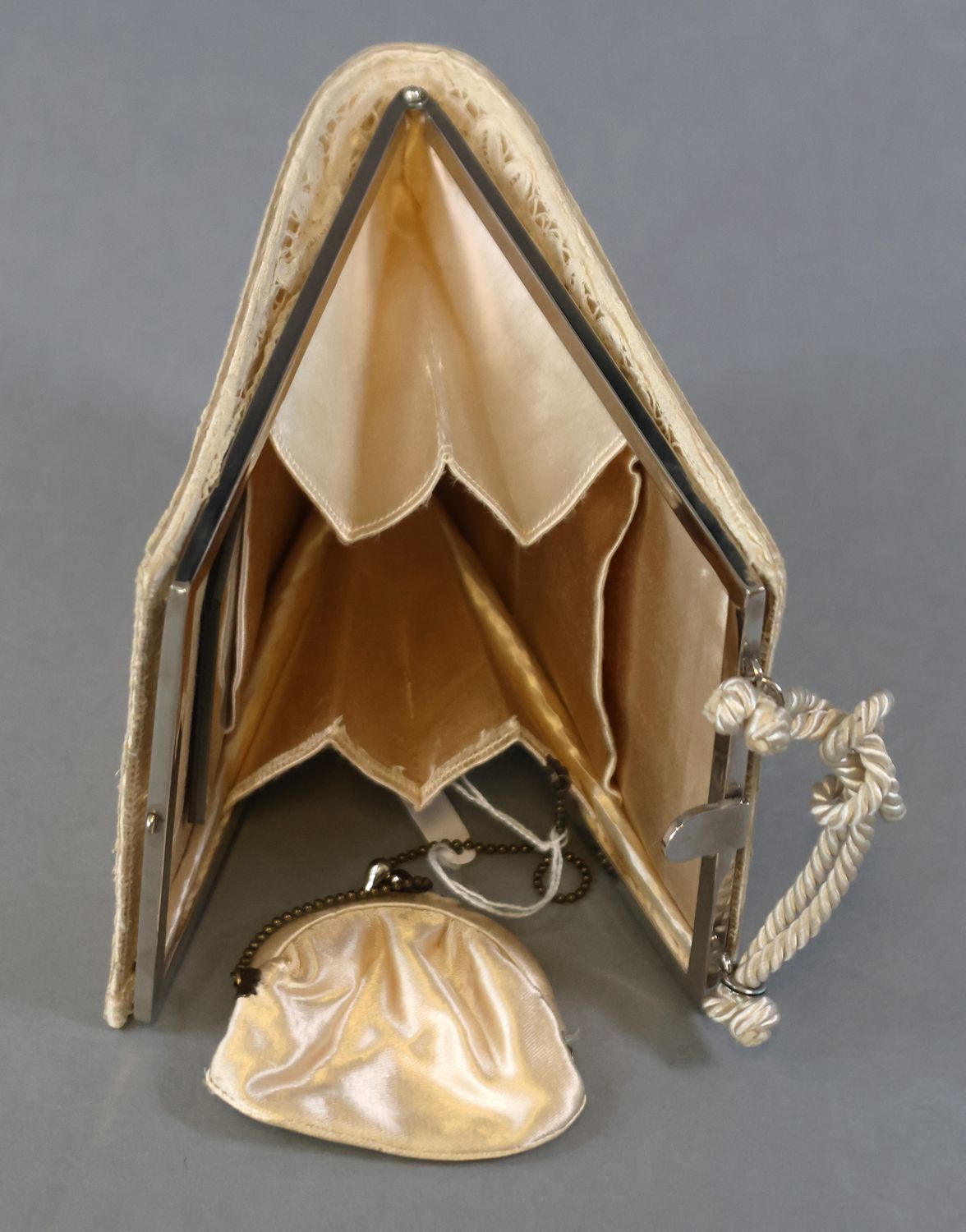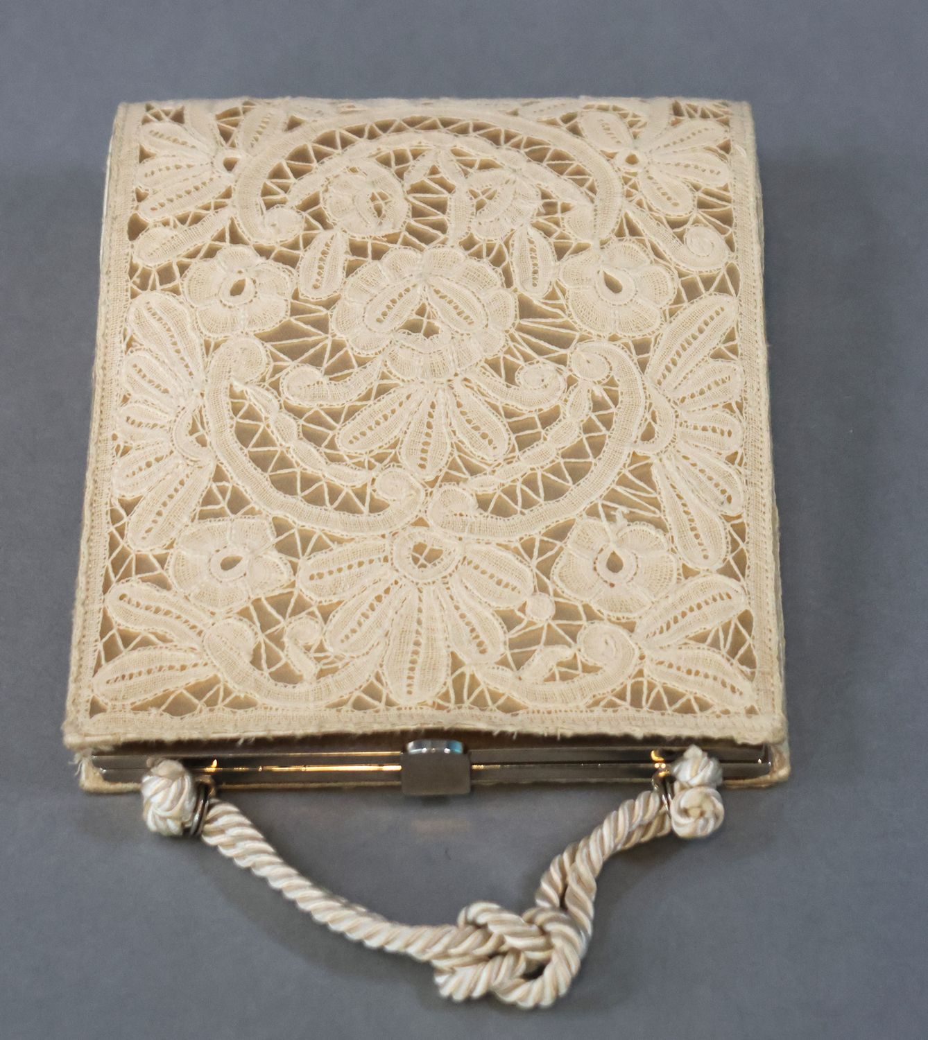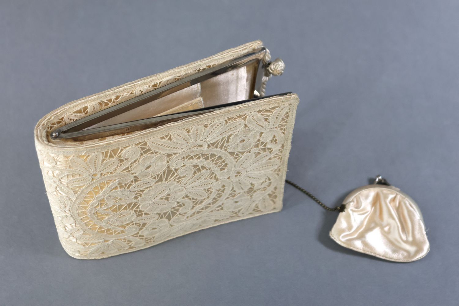 Duchesse-kloskant. met plooien, metalen sluiting en handgrepen in passementerie. Aan de binnenkant een spiegeltje en een geldbuideltje.