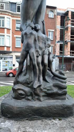 Op de statig gedrapeerde vleugels staan figuren en maskers uitgebeeld. Deze vleugels dragen het beeld en verheffen het boven de grond, op weg naar de hemel, naar de vrijheid. Op het voetstuk worden een aantal verwrongen figuren uitgebeeld, gevangen in het lot van het mensdom. (Uitzonderlijke beeldhouwkunst in Anderlecht, op.cit.).