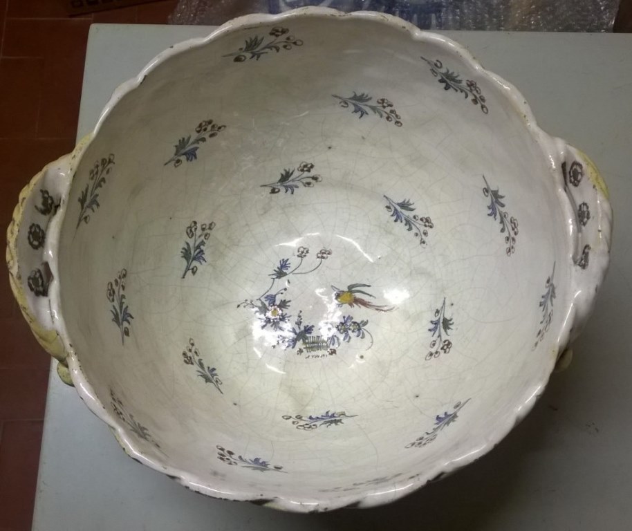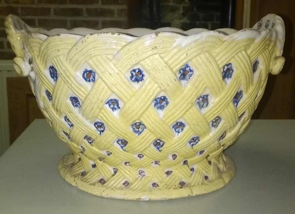 Vlechtwerkversiering (buitenzijde) en decor met de bloeiende haag en vogels (binnenzijde)