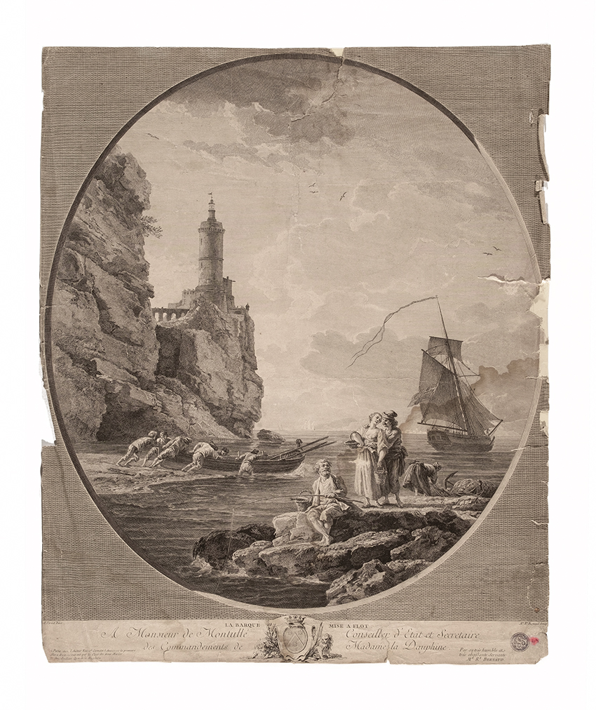 Marie-Rose Bertaud, De boot drijvend, naar Claude-Joseph Vernet, gravure, s.d. [rond 1770 ?].