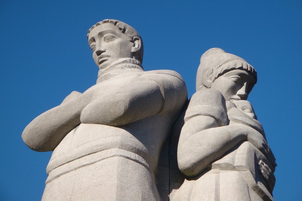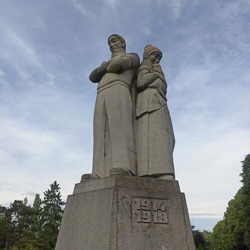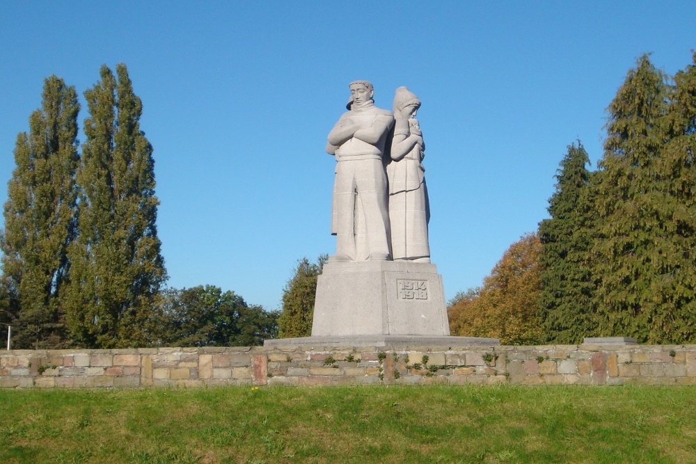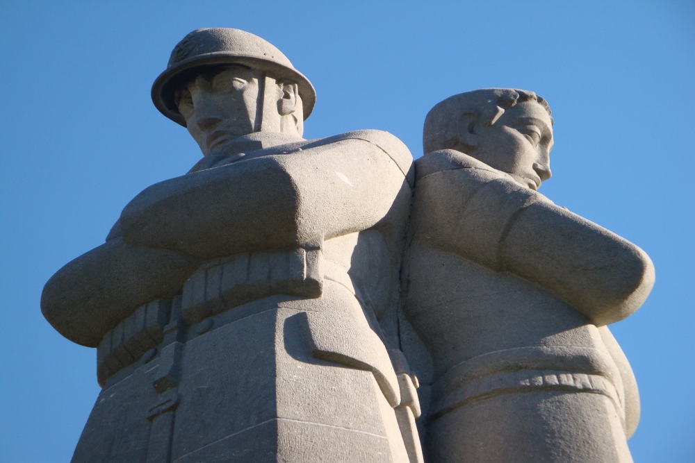 Monumentale voorstelling van drie personages, waarvan de eerste een vrouw is die een baby in haar armen draagt. Aan weerszijden van haar staan een burger met gekruiste armen en een soldaat in dezelfde houding. Ze hebben allemaal hun hoofd lichtjes naar beneden gebogen.