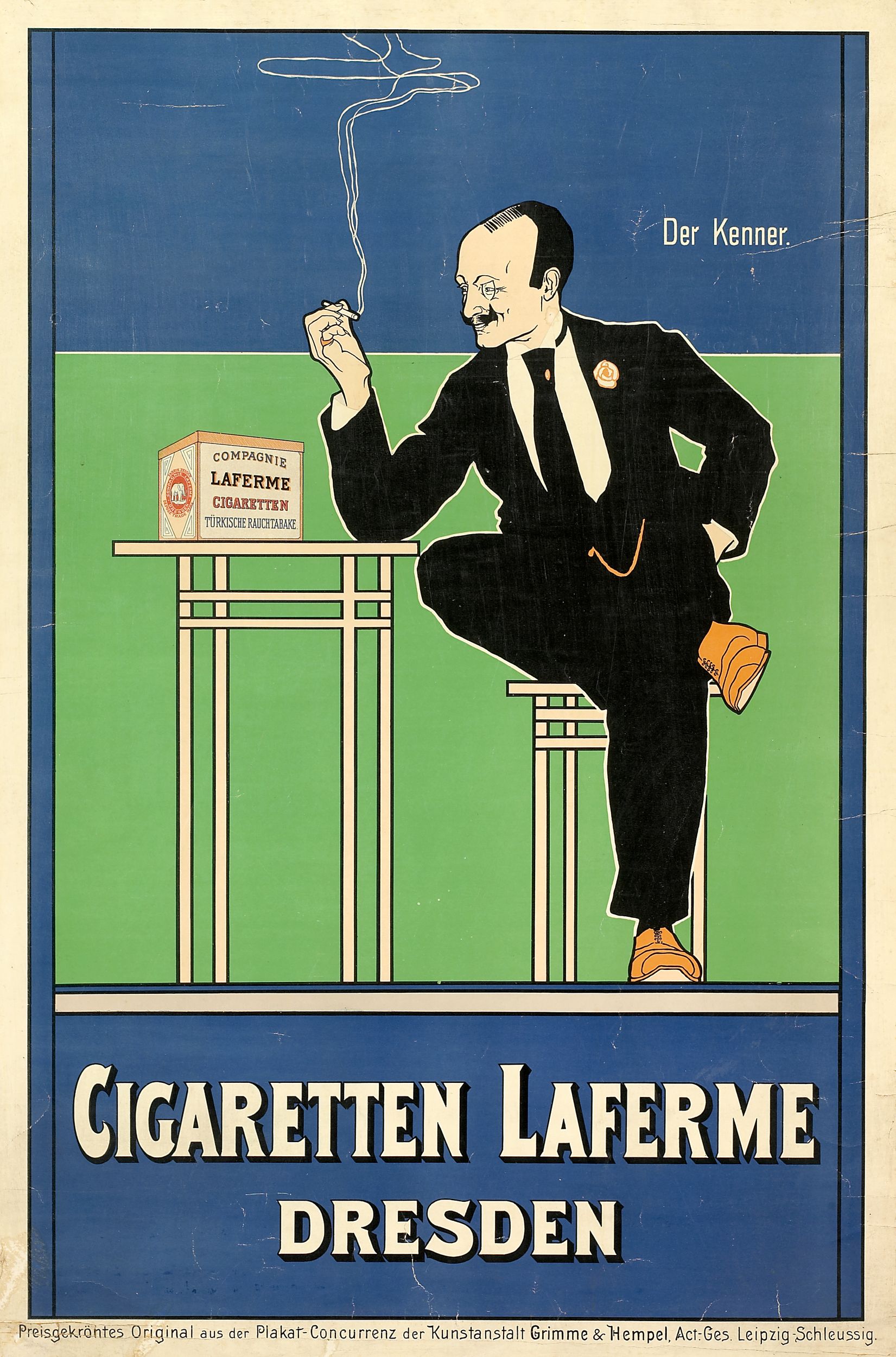 De affiche “Cigaretten Laferme Dresden”, rond 1910 gemaakt door de kunstenaar Fritz Rehm, belichaamt de moderne elegantie en de visuele doeltreffendheid die kenmerkend zijn voor de Duitse affiches van het begin van de 20e eeuw. De compositie van de affiche berust op vlakke kleuren, een duidelijke geometrie en een zuiver getekende afbeelding met scherpe contouren. Deze grafische stijl is typisch voor de Plakatstil, een affichestijl die reageert op de meer decoratieve esthetiek van de Jugendstil (Art Nouveau), die begin 20e eeuw in Duitsland opkomt. Eenvoudig van opzet, toont de afbeelding een man in een elegant zwart kostuum, nonchalant zittend aan een tafel, met een sigaret in de hand waaruit een gestileerde rookwolk opstijgt. Naast hem staat een doos Cigaretten Laferme. Het personage, met een zelfverzekerde blik, wordt aangeduid met de inscriptie “Der Kenner” (“De kenner”), waardoor het beeld ontstaat van een elegant merk, toegankelijk voor wie kwaliteitsproducten weet te waarderen.