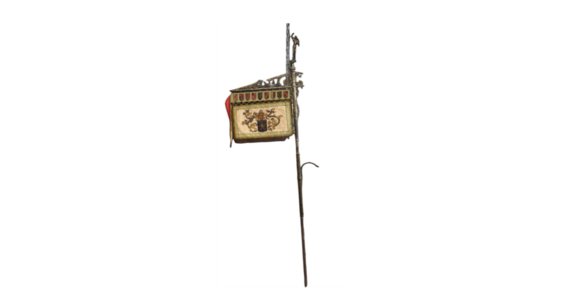De vaandelstok waaraan het vaandel hangt is bovenaan elegant uitgewerkt met smeedwerk van bloemen, bladeren en krullen. Het handvat is bekleed met een bruinkleurig fluweel.