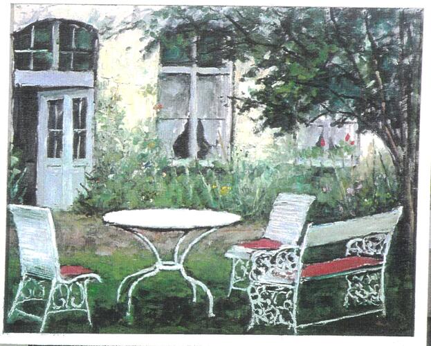 De schilderij van Piet Volckaert, bijgenaamd de Brusselse Utrillo, legt de rust en frisheid van een zonnige tuin vast in een impressionistische compositie. De pasteltinten benadrukken een stoel en een tafel, waardoor een vredige en harmonieuze sfeer ontstaat.