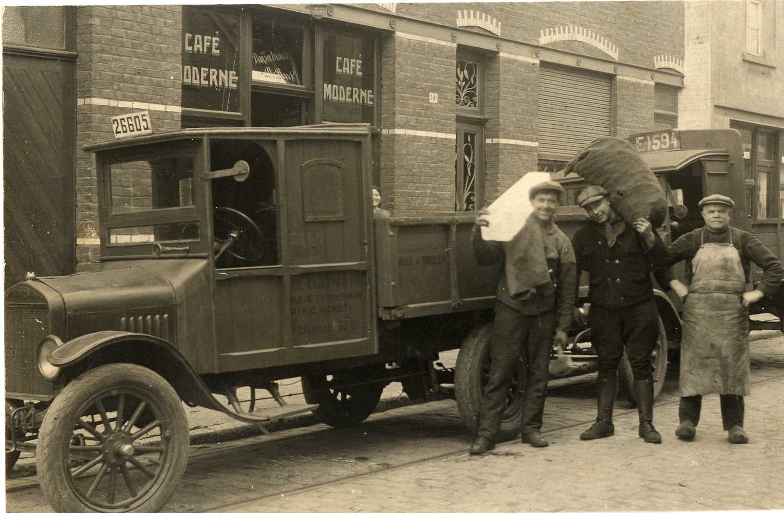Fotokaart IJs- en brandhoutbezorgers en hun vrachtwagen, firma Fr. De Keuleneer, Balsamijnstraat 2 (Brussel), “Café moderne”, fotogr. onbekend, s.d. [rond 1928].