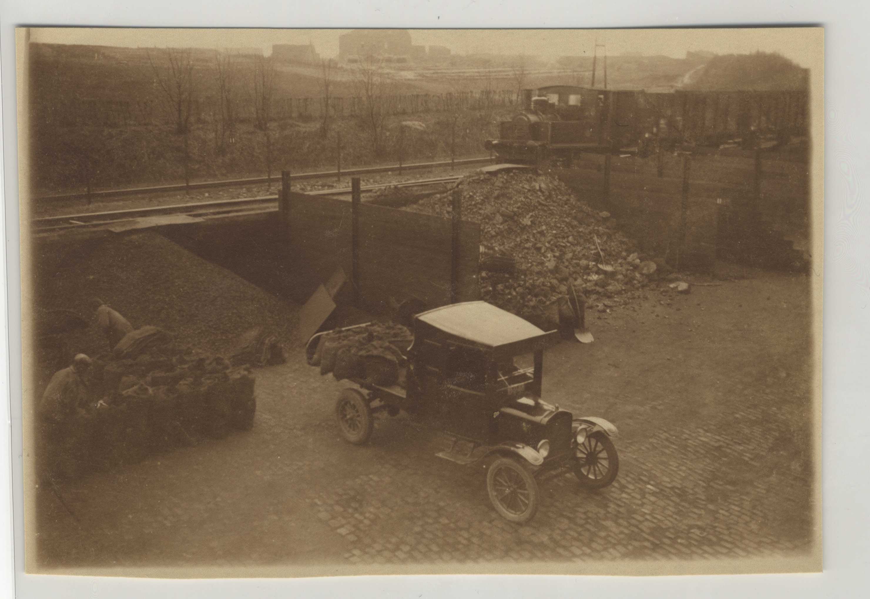 Fotokaart Arbeiders die kolen in zakken doen (bij het Weststation, Sint-Jans-Molenbeek?), fotogr. onbekend, s.d. [jaren 1920-1930?].