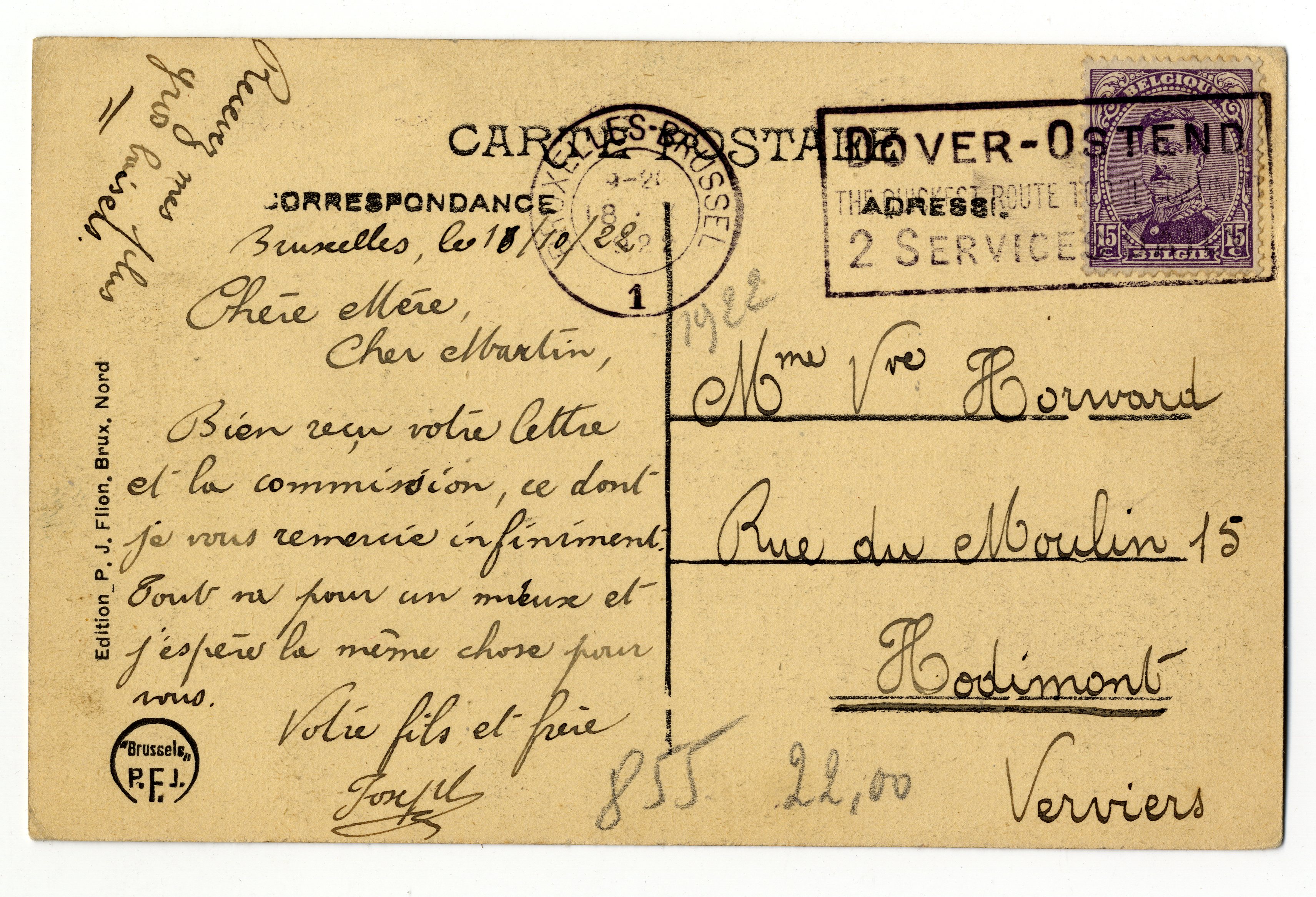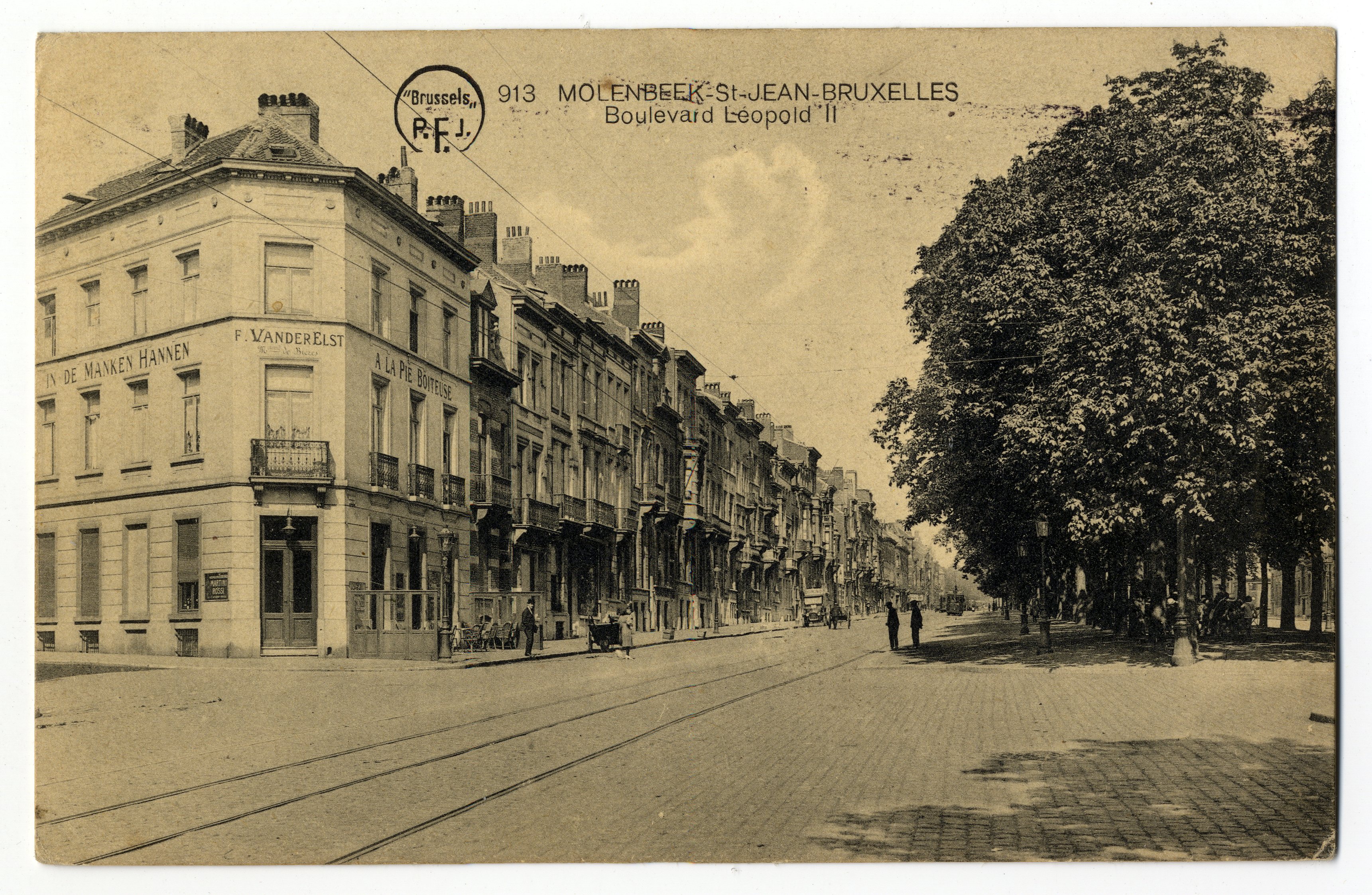 Prentkaart Leopold II-laan en Houzeaustraat 1, café F. Vander Elst “In de Manken Hannen - A la pie boiteuse” (Sint-Jans-Molenbeek), uitg. P.J. Flion (Brussel), 1922.