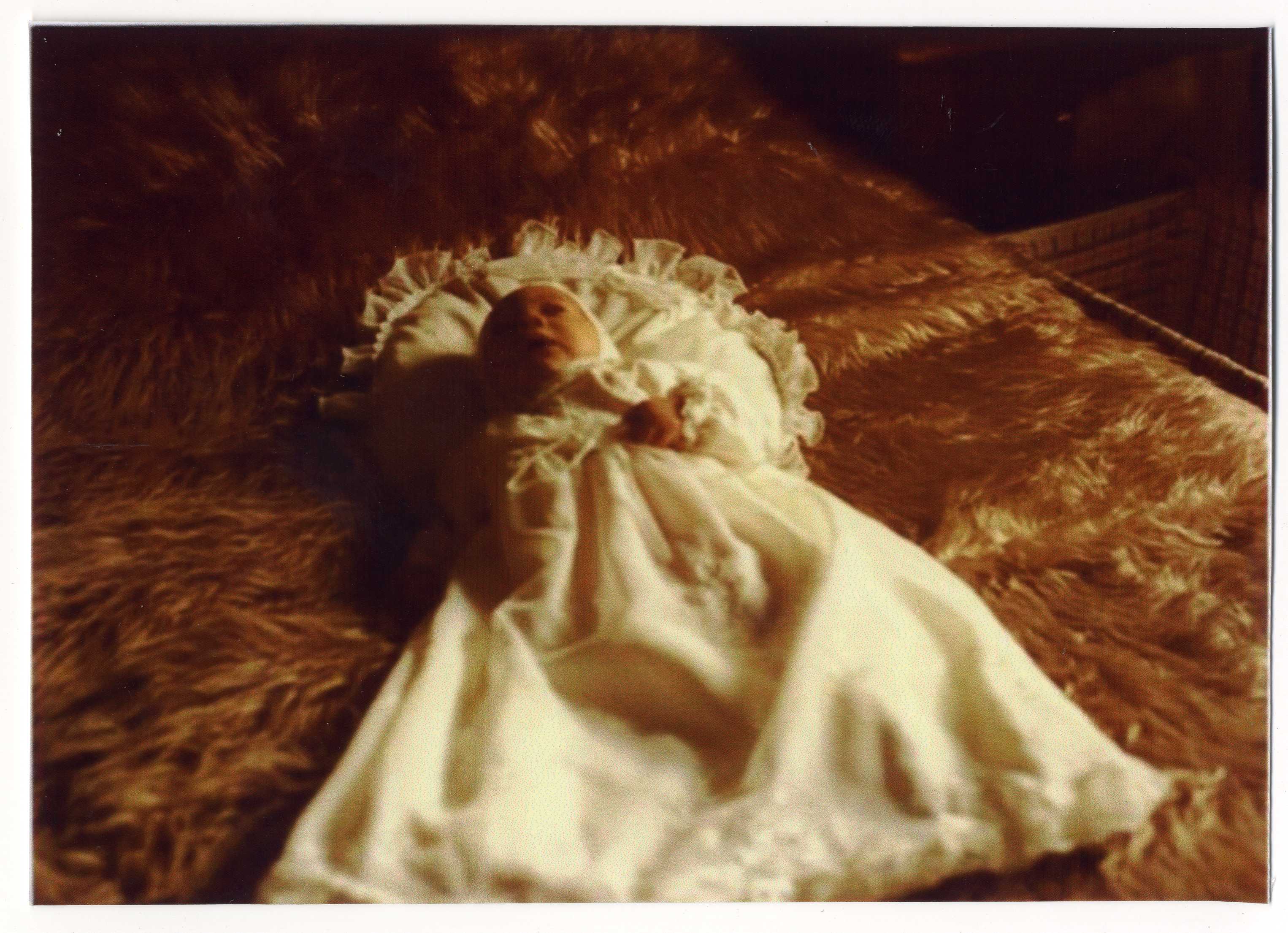 Foto Een kind uit Molenbeek gekleed in een doopjurk, fotogr. onbekend, 1977.