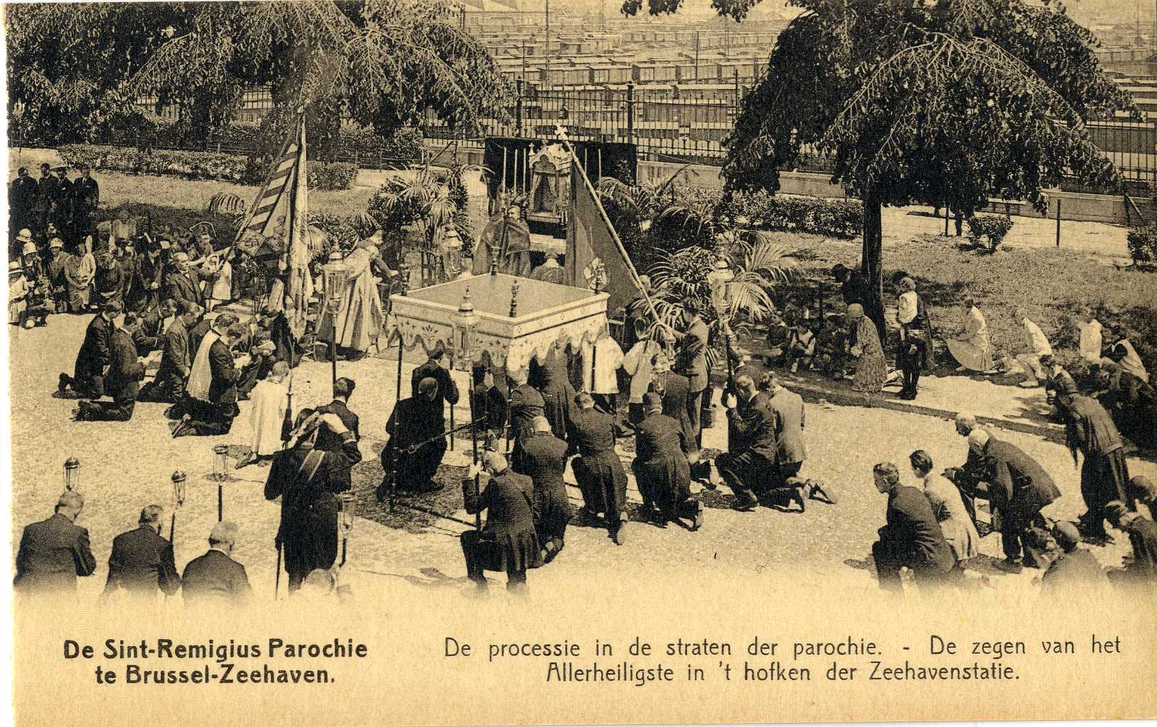 Prentkaart De Sint-Remigius parochie te Brussel-Zeehaven (Sint-Jans-Molenbeek), processie in de straten met eucharistische aanbidding, z.uitg., s.d. [rond 1925].