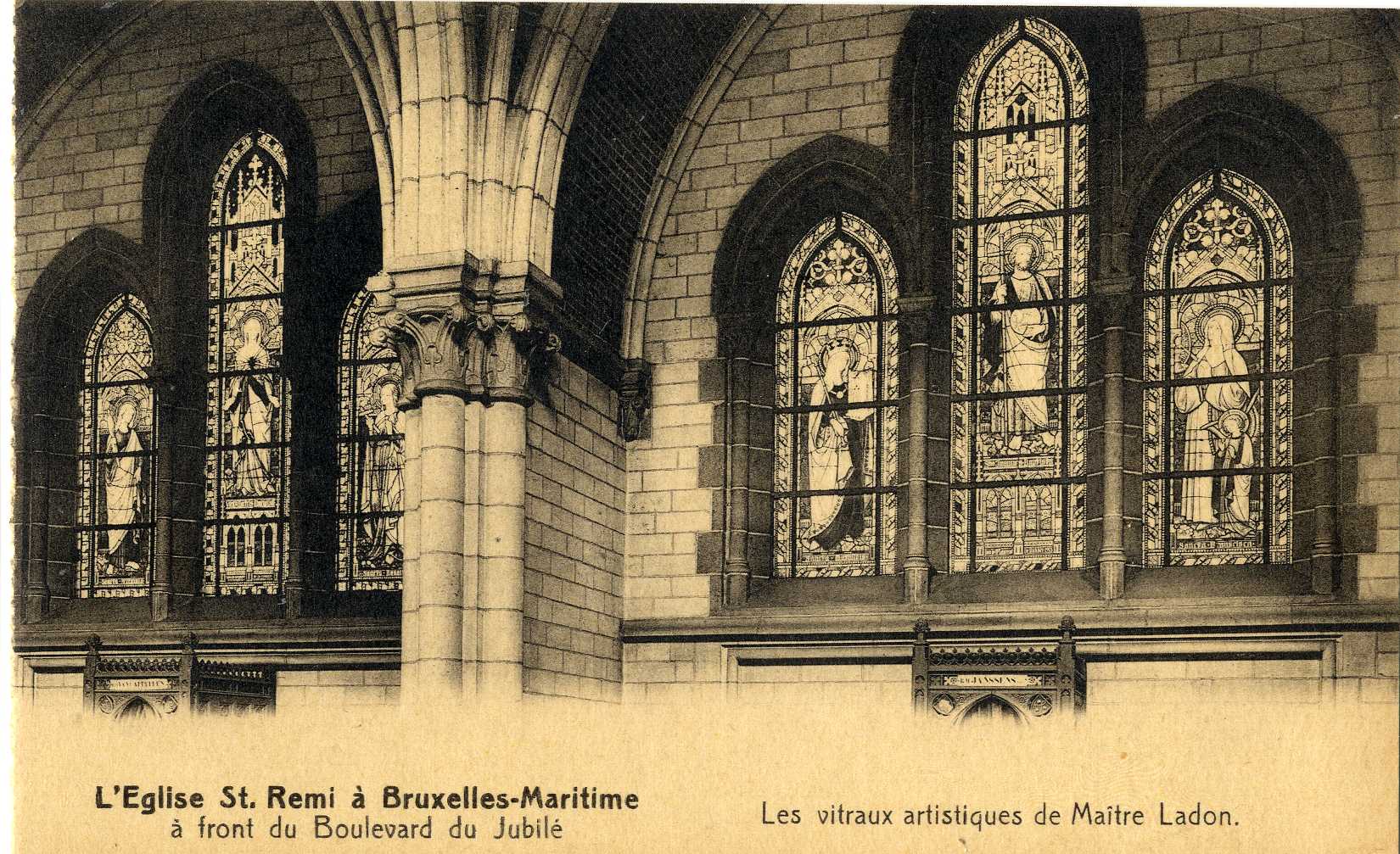 "L'Eglise St. Remi à Bruxelles-Maritime à front du Boulevard du Jubilé / Les vitraux artistiques de Maître Ladon."
