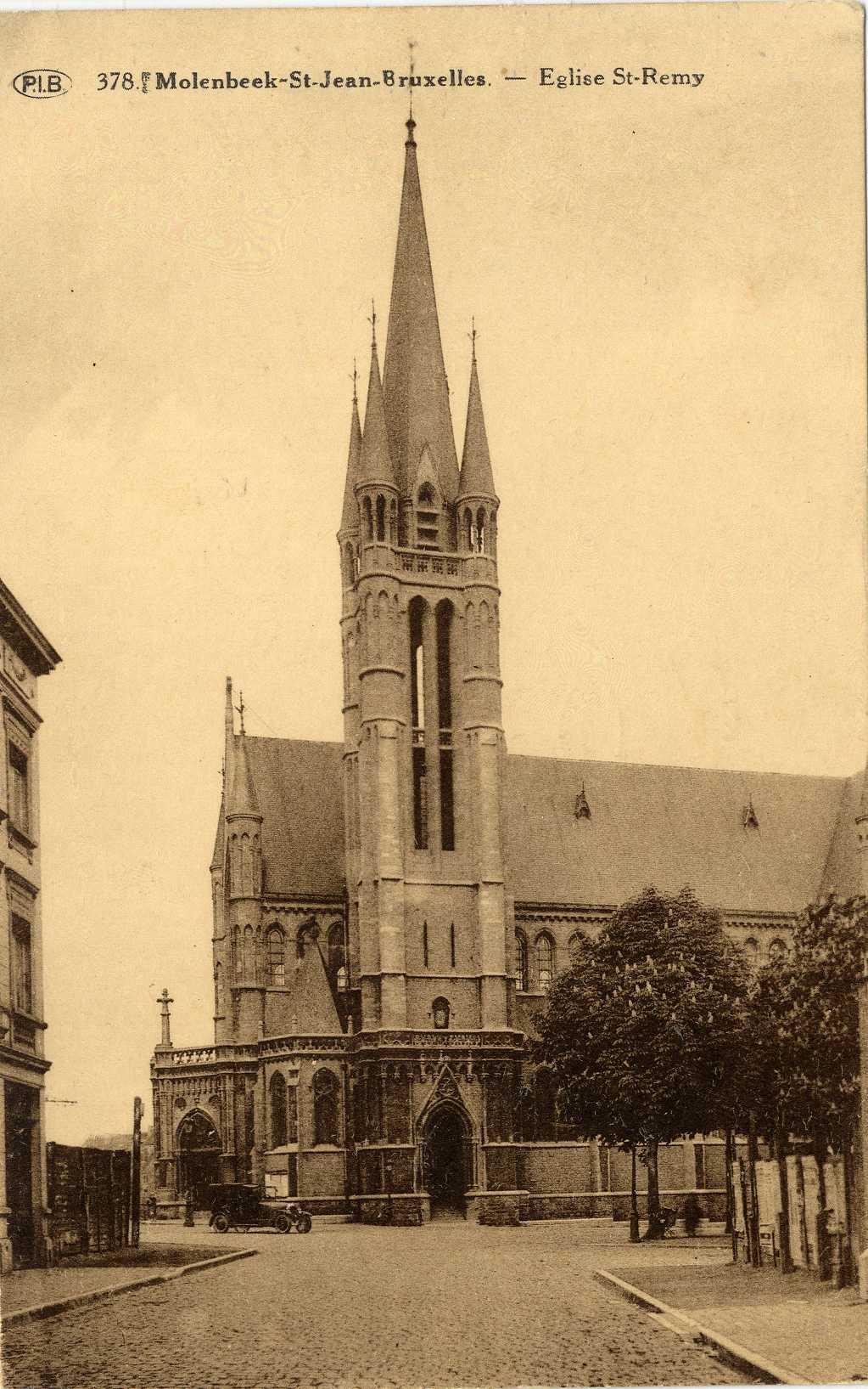 Prentkaart Sint-Remigiuskerk gezien vanuit de Ourthestraat (Sint-Jans-Molenbeek), uitg. P.I.B. (Sint-Jans-Molenbeek), s.d. [jaren 1920].