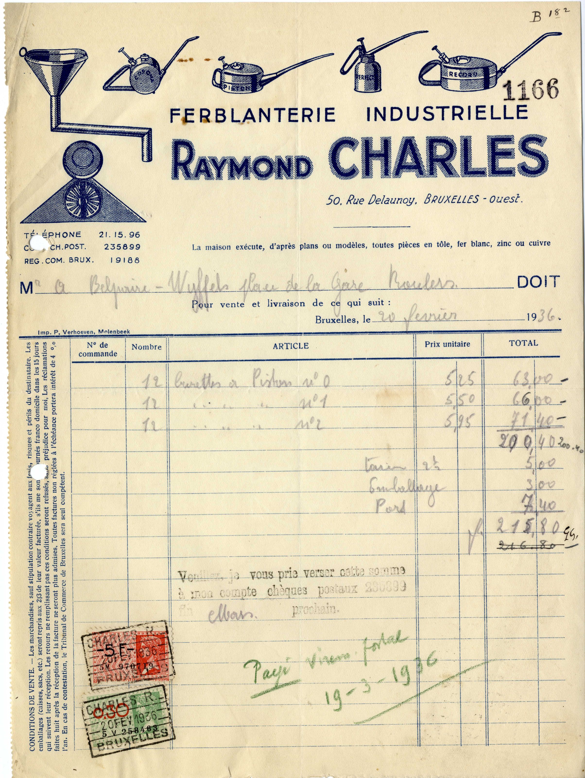 Factuur "Ferblanterie industrielle Raymond Charles", Delaunoystraat 50 (Sint-Jans-Molenbeek), 1936.