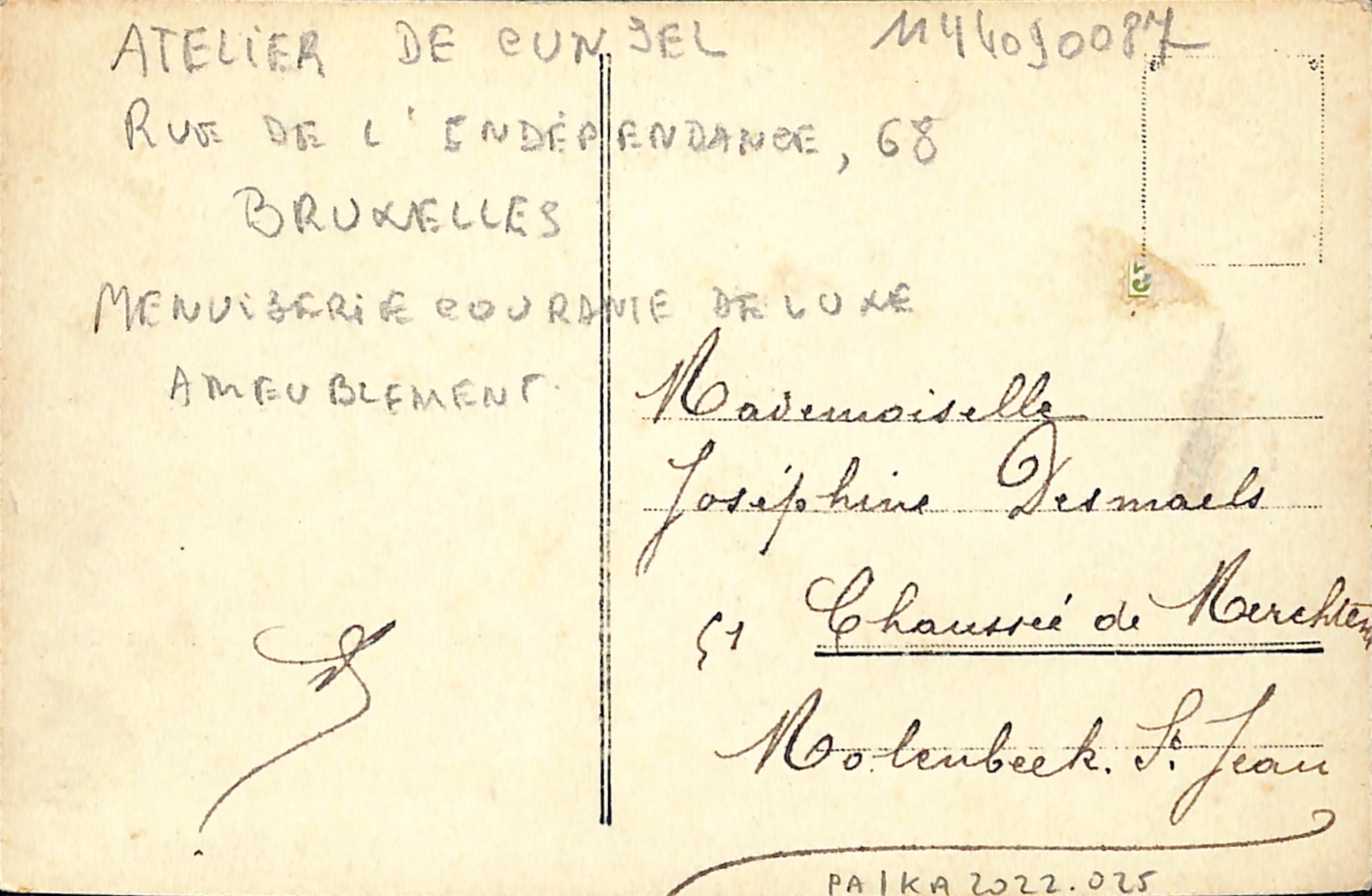 "Atelier De Cunsel / Rue de l'Indépendance, 68 / Bruxelles / Menuiserie ordinaire [et] de luxe / ameublement"