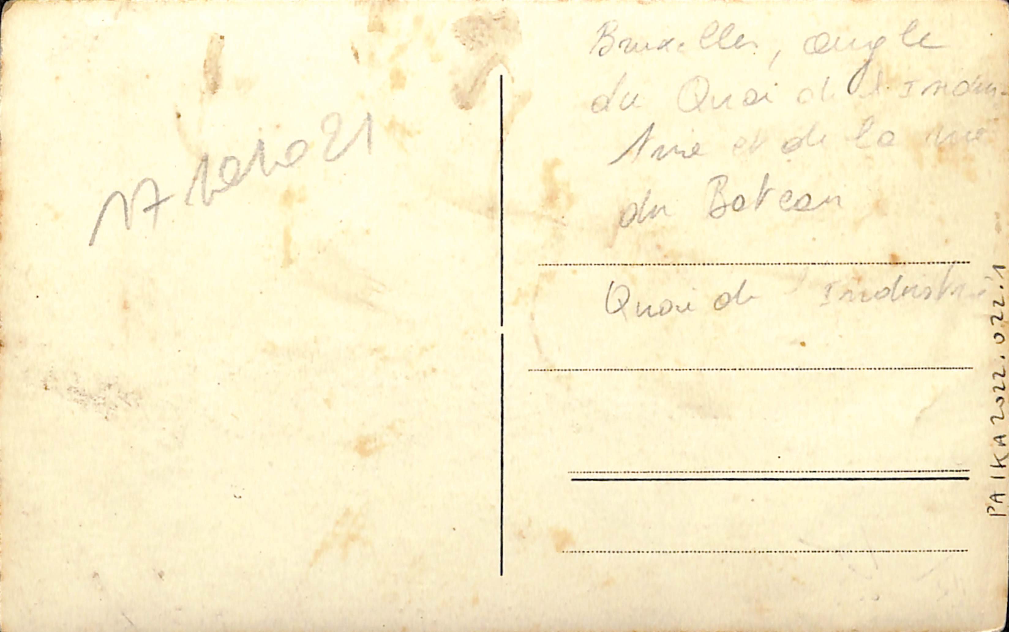 "Bruxelles, angle / du Quai de l'Indus- / et de la rue / du Bateau / Quai de l'Industrie"