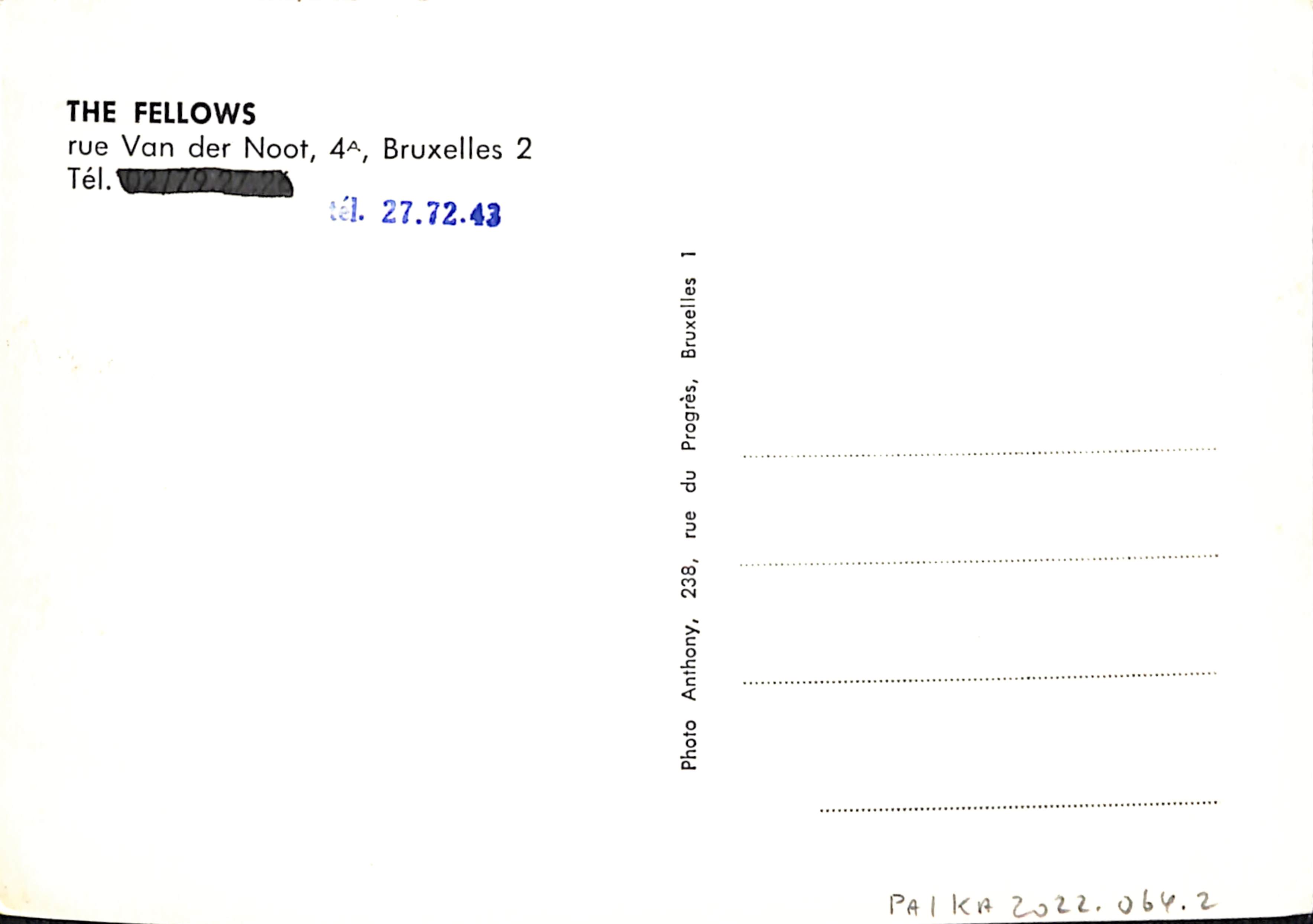 Onderschrift op de achterkant: “THE FELLOWS / rue Van der Noot [sic!], 4A, Brussels 2 / Tel [nummer doorgestreept en vervangen door volgende stempel] tel. 27.72.43”.