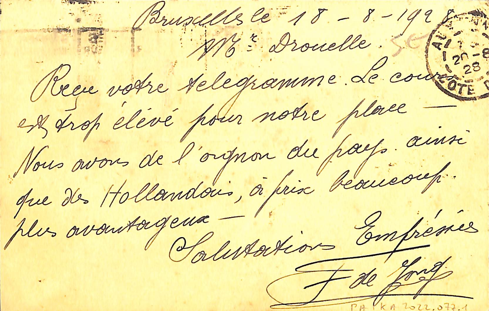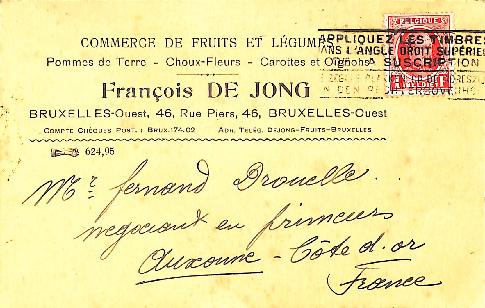Brief van François De Jong aan een Franse groenteboer, Fernand Drouelle, in Auxonne (Côte d'or).