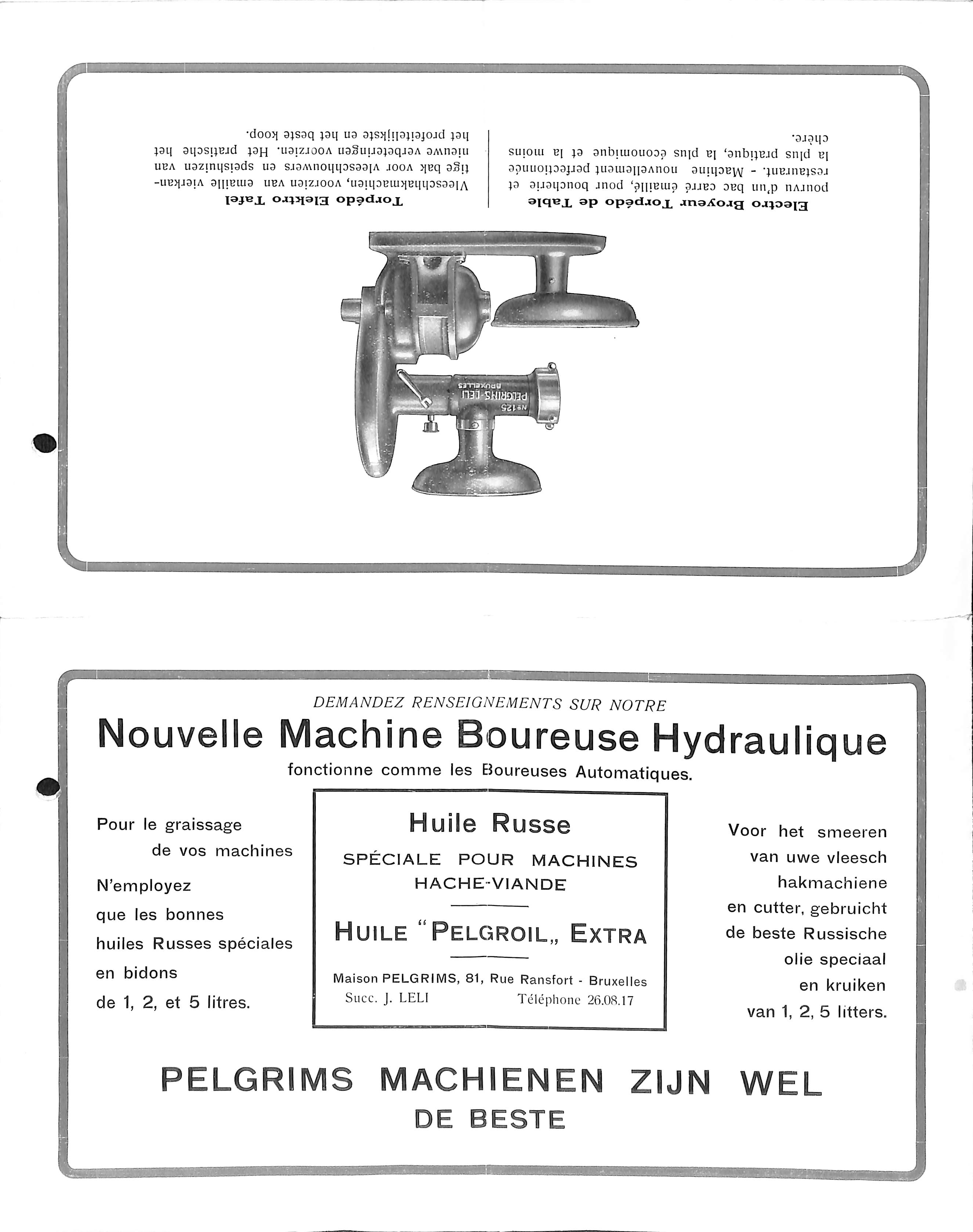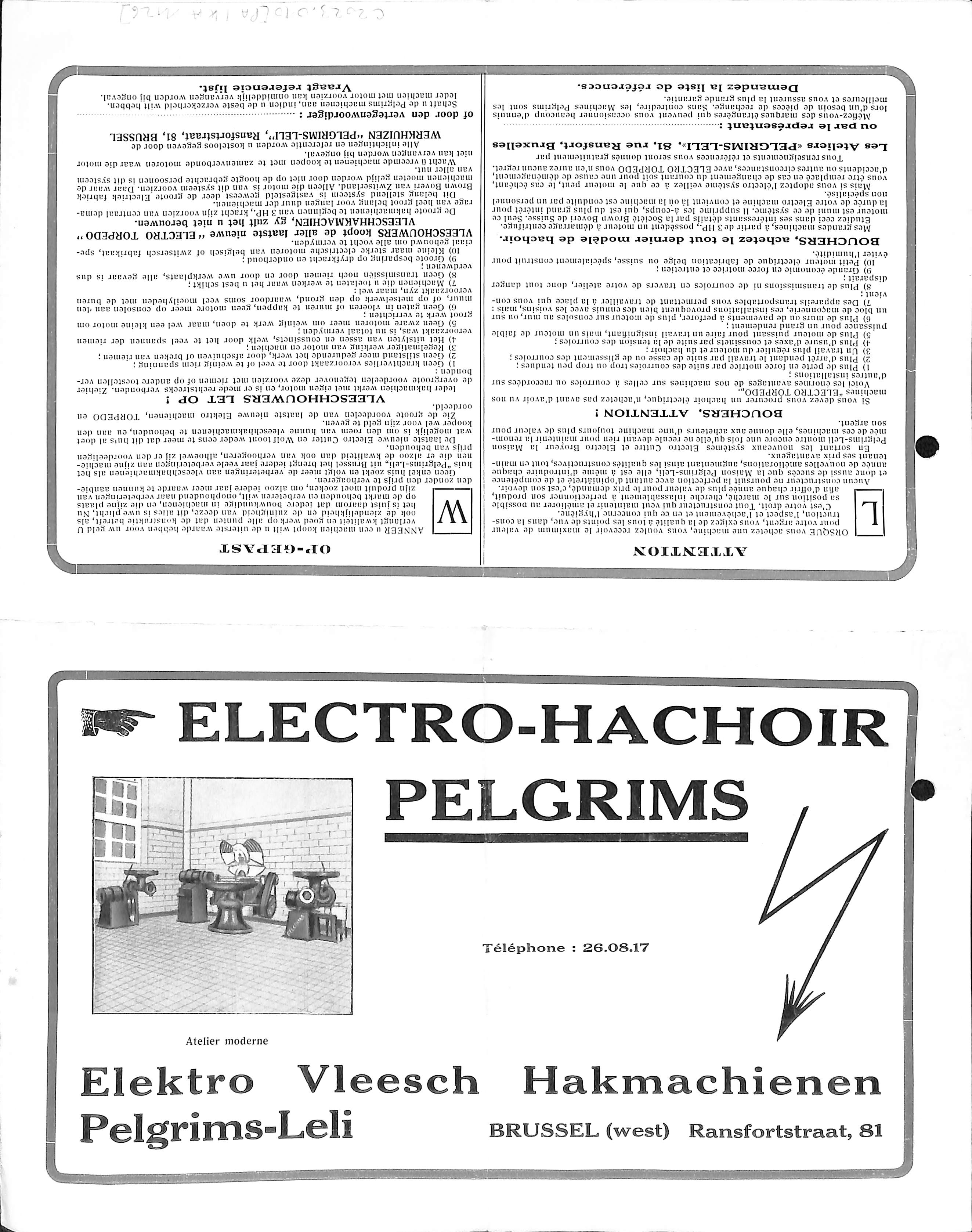 Reclamefolder Electro-hakmolen Pelgrims, Ransfortstraat 81 (Sint-Jans-Molenbeek), s.d.