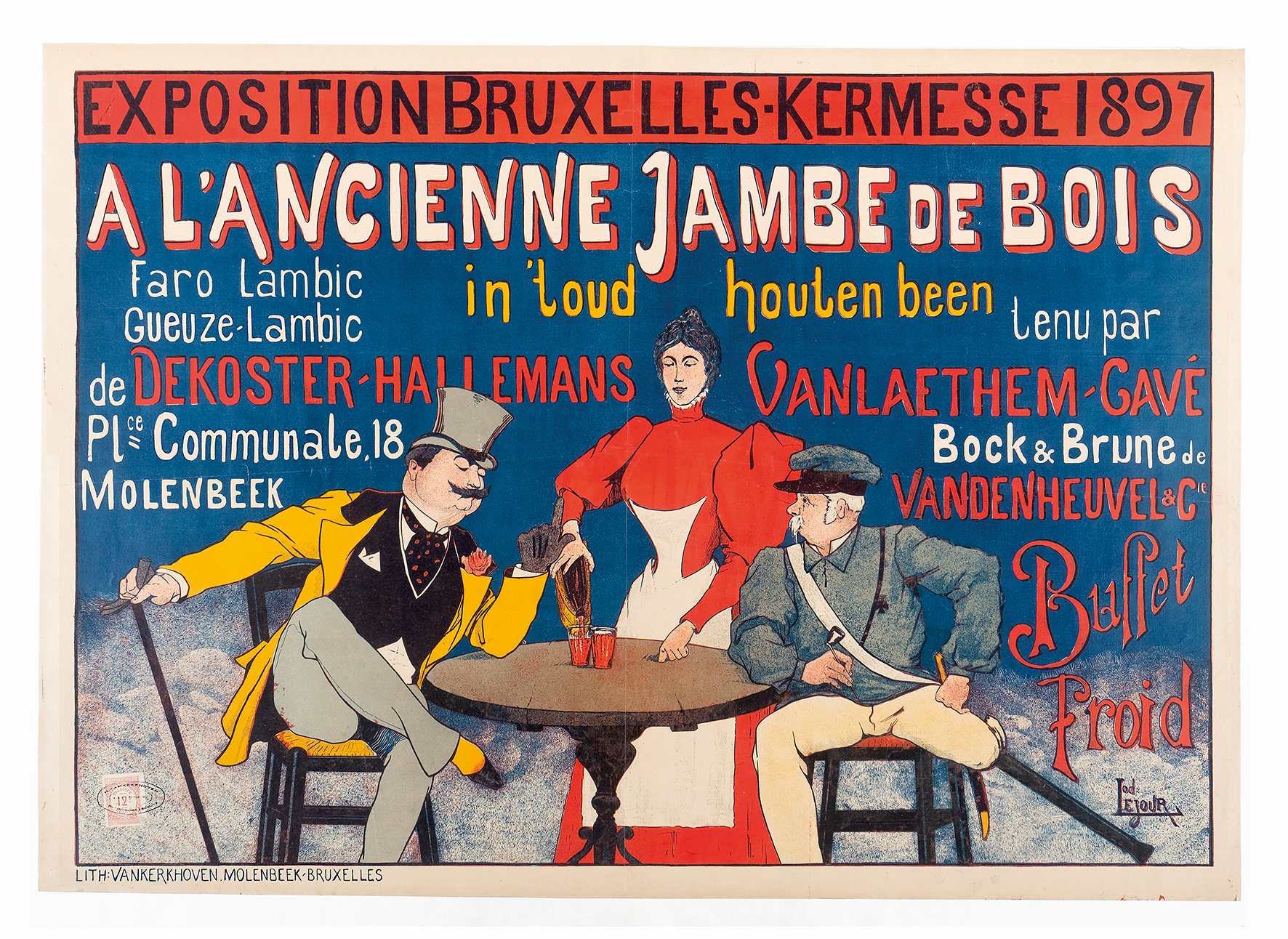 Reclameaffiche “A l'ancienne jambe de bois”, tentoonstelling "Bruxelles-Kermesse", tekening Lod. Lejour, lithogr. Vankerkhoven (Sint-Jans-Molenbeek), 1897.