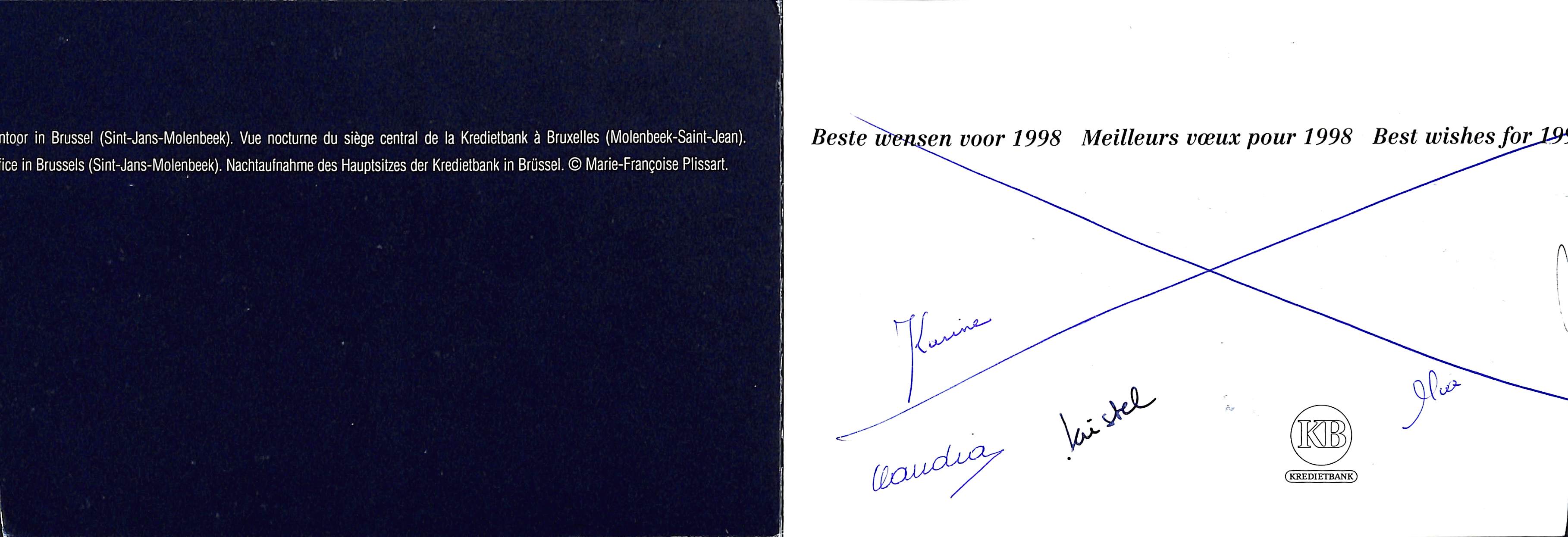 Nieuwjaarskaart 1998 Hoofdkantoor KBC, Havenlaan en Opzichterstraat (Sint-Jans-Molenbeek), fotogr. Marie-Françoise Plissart, 1998.