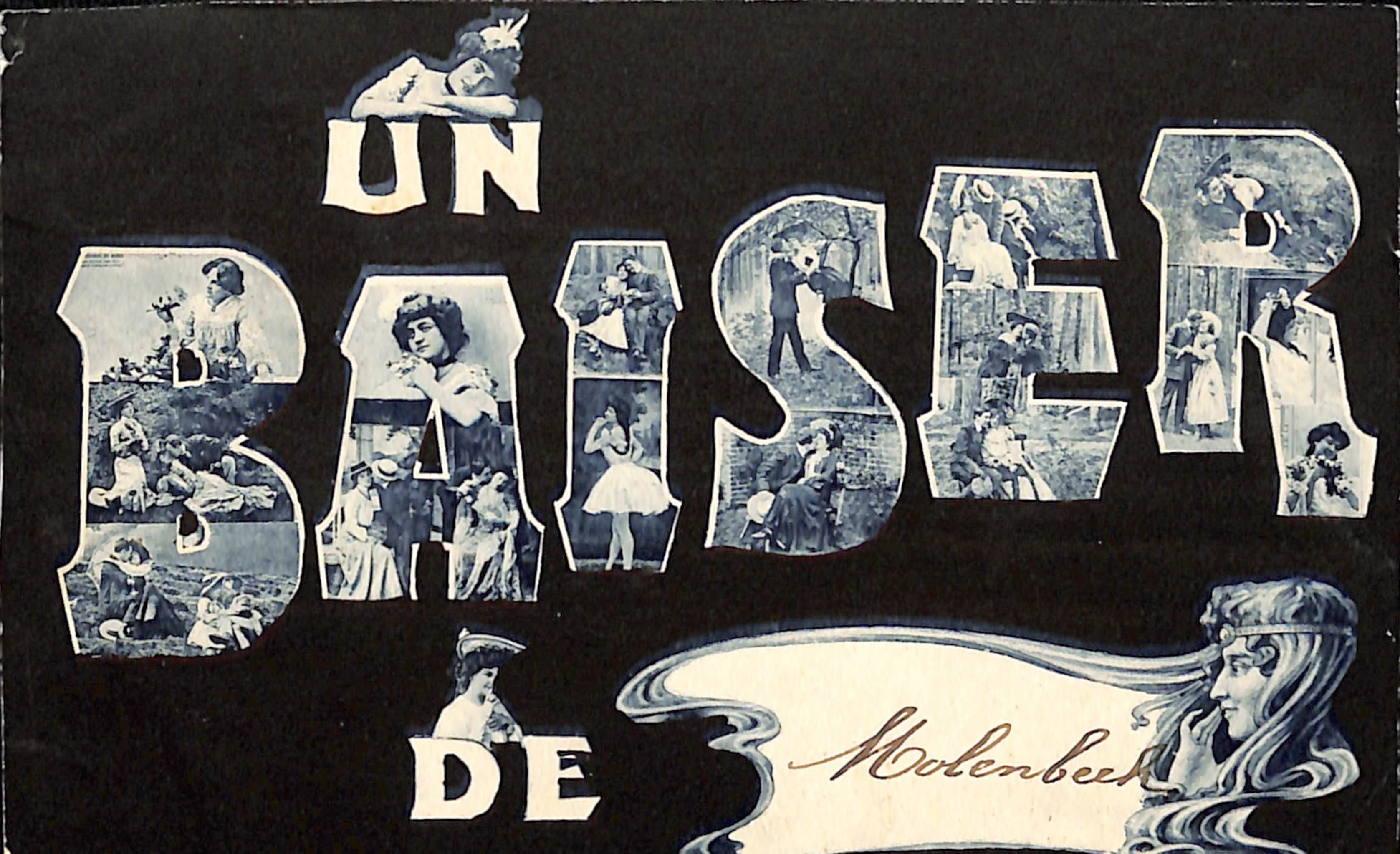 Fantasiekaart “Un baiser de Molenbeek" [Een kus uit Molenbeek], z.uitg., s.d. [begin 20ste eeuw].