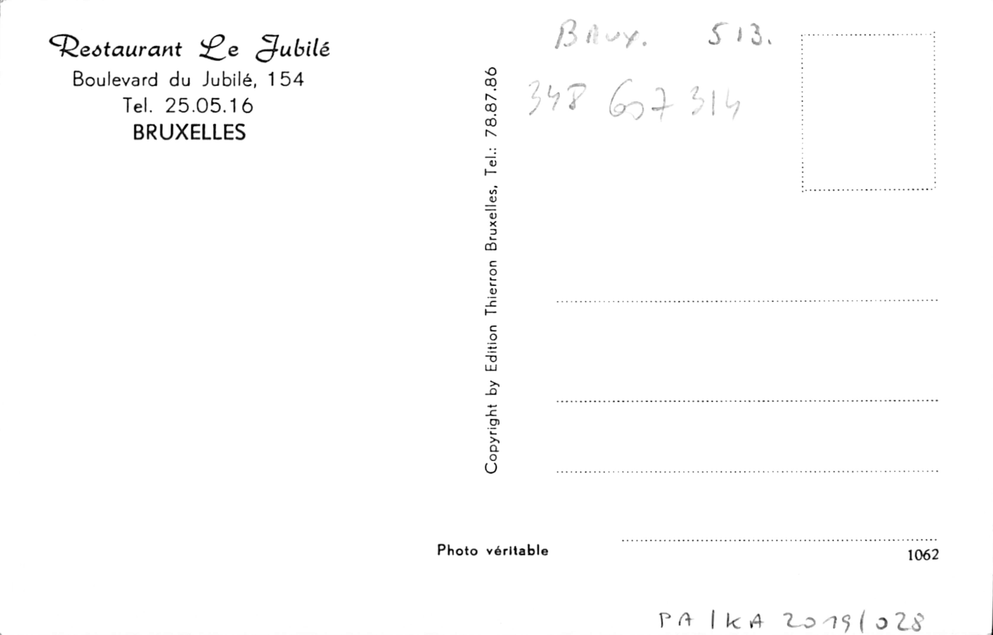 "Restaurant Le Jubilé / Boulevard du Jubilé, 154 / Tel. 25.05.16 / Bruxelles" (legende op de achterkant)