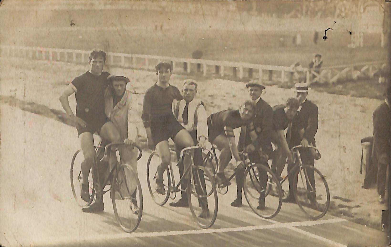 Fotokaart Start van een race in het Karreveld velodrome (Sint-Jans-Molenbeek), fotogr. L. Hoogewijs (Sint-Jans-Molenbeek), s.d. [ca. 1910].