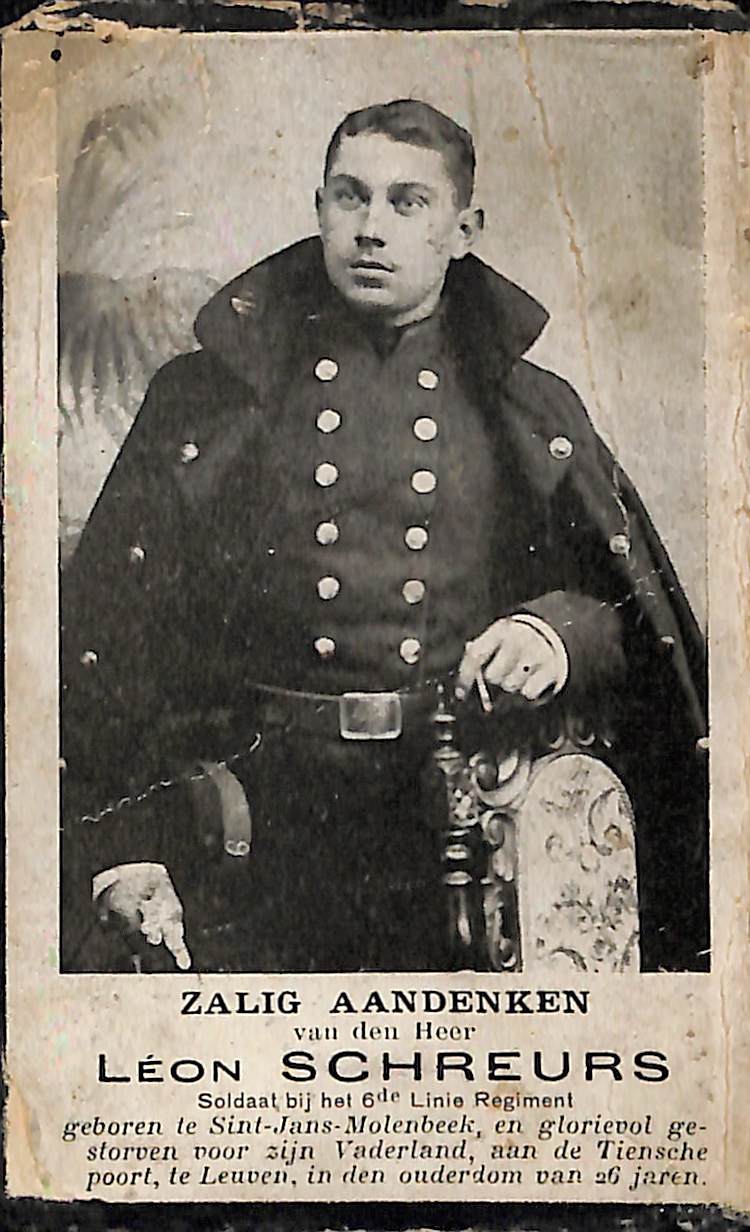 "Zalig aandenken / van den Heer / Léon Schreurs / Soldaat bij het 6e Linie Regiment / geboren te Sint-Jans-Molenbeek, en glorievol ge- / storven voor zijn Vaderland, aan de Tiensche / poort, te Leuven, in den ouderdom van 26 jaren."