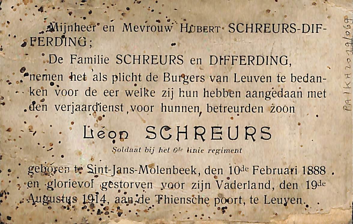 Doodsfprentje Léon Schreurs, soldaat van het 6e Linieregiment (Sint-Jans-Molenbeek, 1888 - Leuven, 1914), s.d. [1914?].