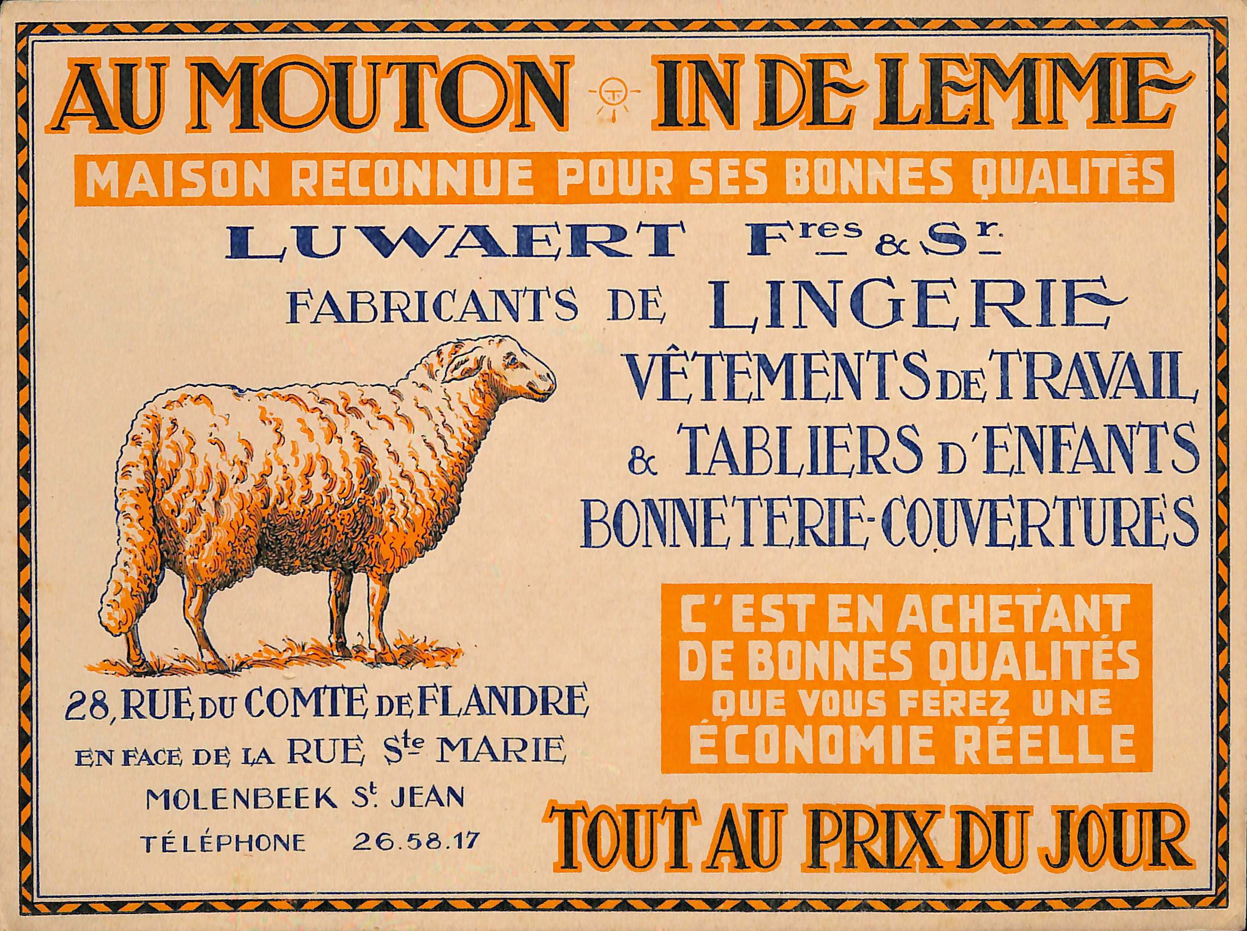 Reclamekaart Luwaert fres & sr “Au Mouton - In de Lemme”, fabrikant van lingerie, werkkleding enz., Graaf van Vlaanderenstraat 28 (Sint-Jans-Molenbeek), s.d. [ca. 1950].