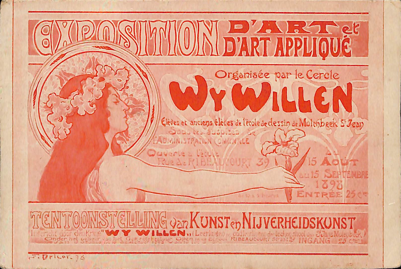 Reclamekaart Tentoonstelling beeldende en toegepaste kunst, Kring "Wy Willen", de Ribaucourtstraat 39 (Sint-Jans-Molenbeek), uitg. F. Dricot, 1898.