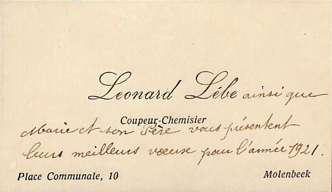 Visitekaartje Leonard Lébe, snijder-hemdenmaker, Gemeenteplein 10 (Sint-Jans-Molenbeek), 1920-1921.